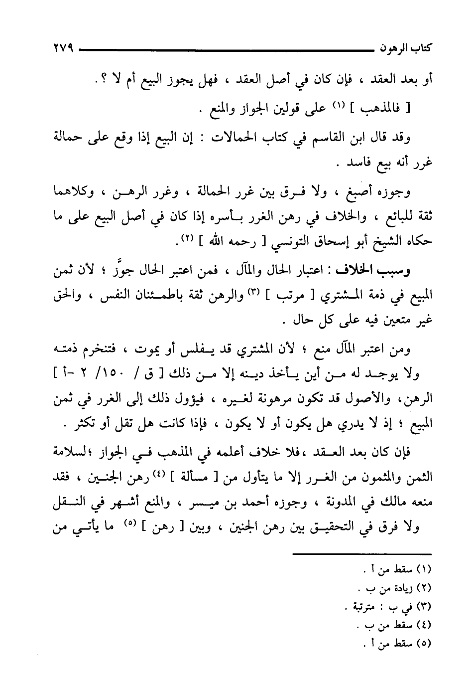 وجوزه أصبغ، ولا فرق بين غرر الحمالة، وغرر الرهن، وكلاهما ثقة للبائع، والخلاف في رهن الغرر بأسره إذا كان في أصل البيع على ما حكاه الشيخ أبو إسحاق التونسي [رحمه الله] (¬2).