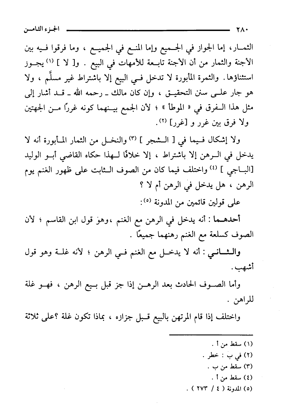 الثمار، إما الجواز في الجميع وإما المنع في الجميع، وما فرقوا فيه بين الأجنة والثمار من أن الأجنة تابعة للأمهات في البيع. و [لا] (¬1) يجوز استثناؤها. والثمرة المأبورة لا تدخل في البيع إلا باشتراط غير مسلَّم، ولا هو جار على سنن التحقيق، وإن كان مالك -رحمه الله- قد أشار إلى مثل هذا الفرق في "الموطأ"، لأن الجمع بينهما كونه غررًا من الجهتين ولا فرق بين غرر و [غرر] (¬2).
