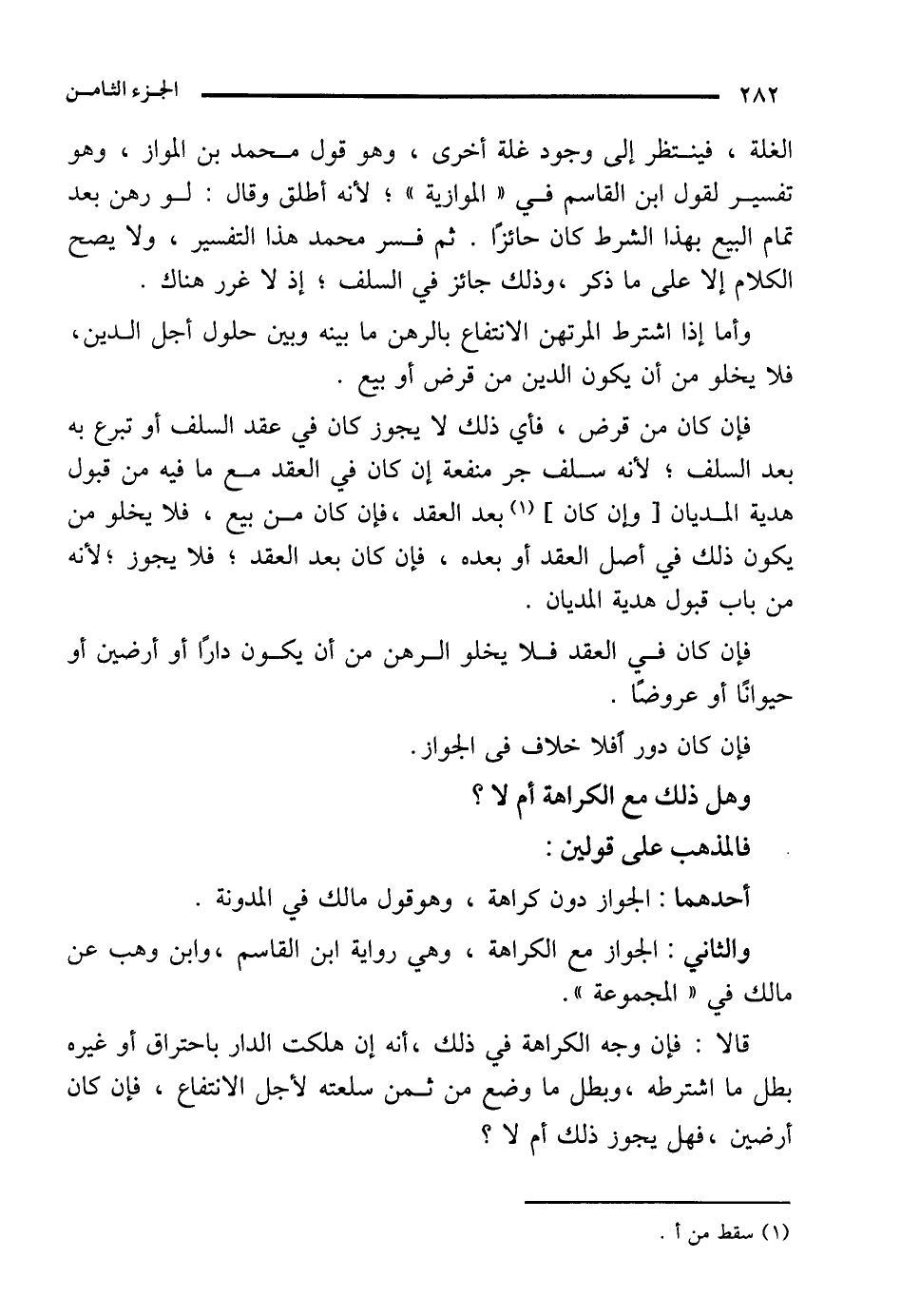 قالا: فإن وجه الكراهة في ذلك، أنه إن هلكت الدار باحتراق أو غيره بطل ما اشترطه، وبطل ما وضع من ثمن سلعته لأجل الانتفاع، فإن كان أرضين، فهل يجوز ذلك أم لا؟