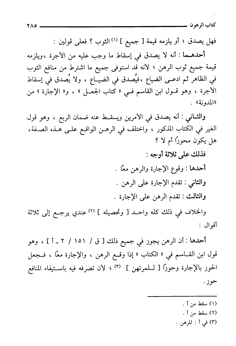 والثاني: أنه يصدق في الأمرين ويسقط عنه ضمان الربع، وهو قول الغير في الكتاب المذكور، واختلف في الرهن الواقع على هذه الصفة، هل يكون محوزًا أم لا؟
