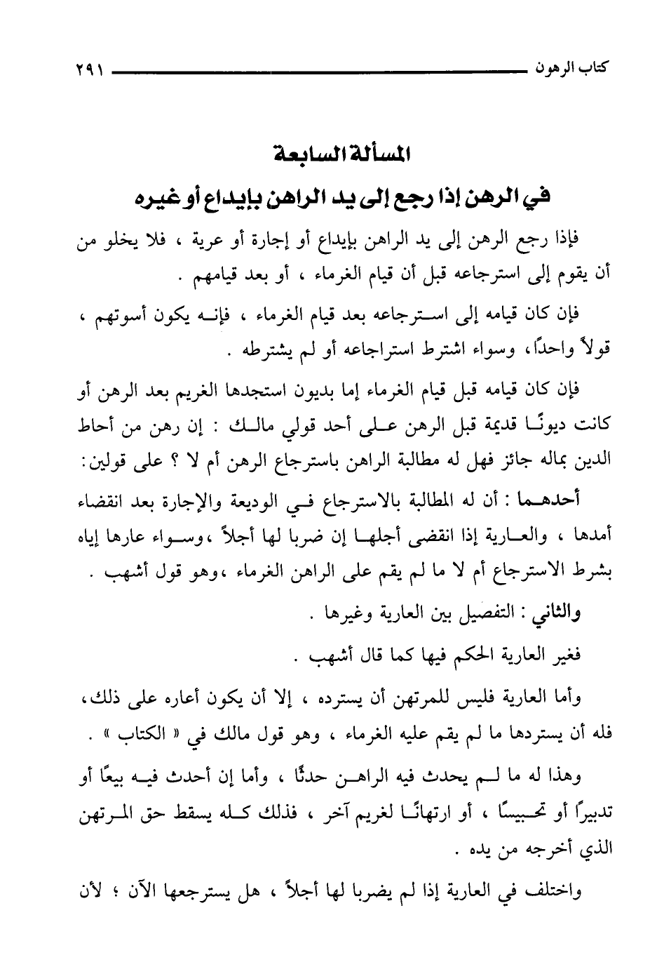 المسألة السابعة في الرهن إذا رجع إلى يد الراهن بإيداع أو غيره