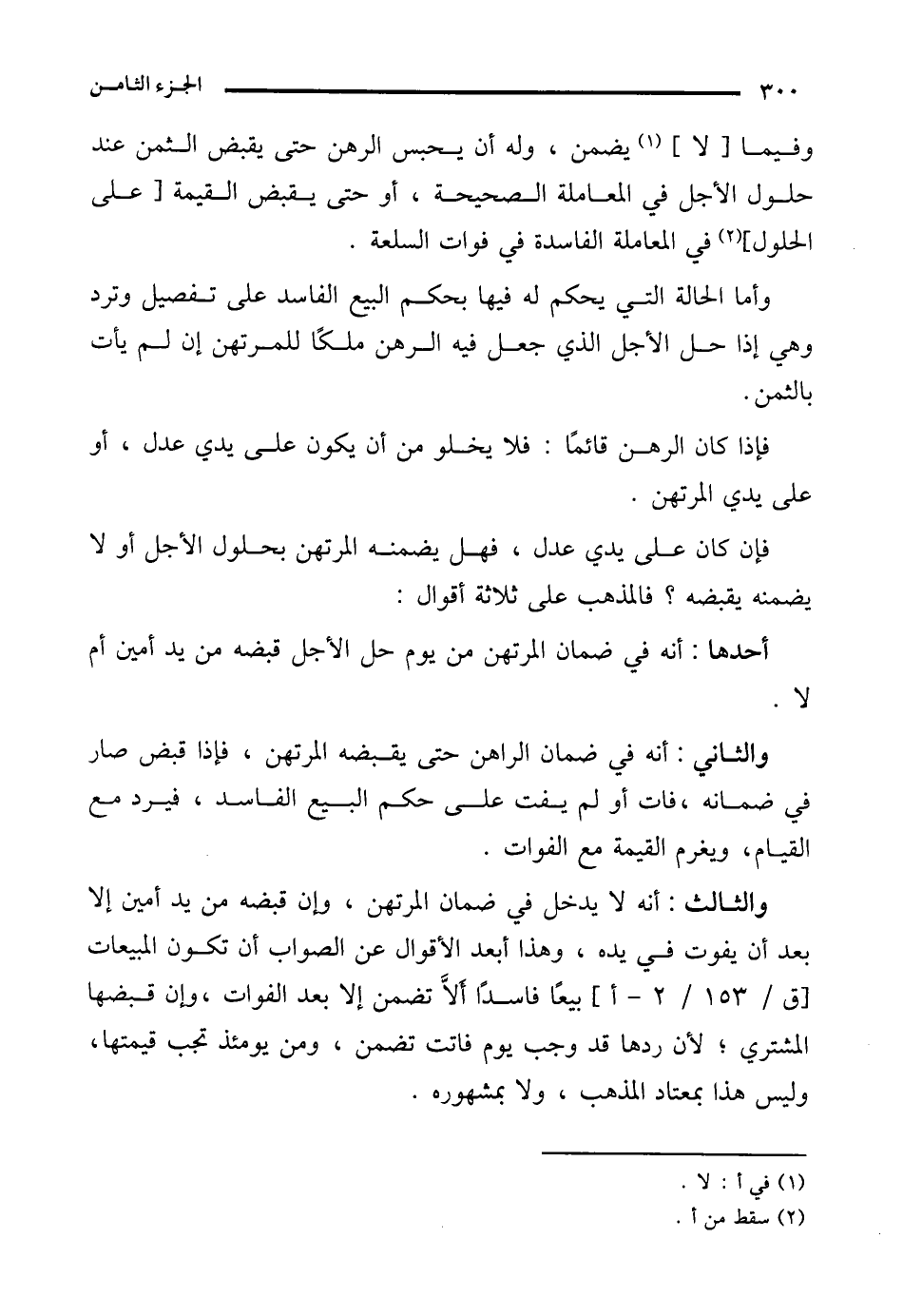 وفيما [لا] (¬1) يضمن، وله أن يحبس الرهن حتى يقبض الثمن عند حلول الأجل في المعاملة الصحيحة، أو حتى يقبض القيمة [على الحلول] (¬2) في المعاملة الفاسدة في فوات السلعة.