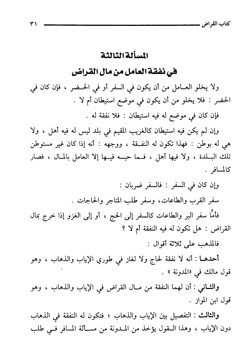 فأمَّا سفر البر والطاعات كالسفر إلى الحج، أو إلى الغزو إذا خرج بمال القراض: هل تكون له فيه النفقة أم لا؟