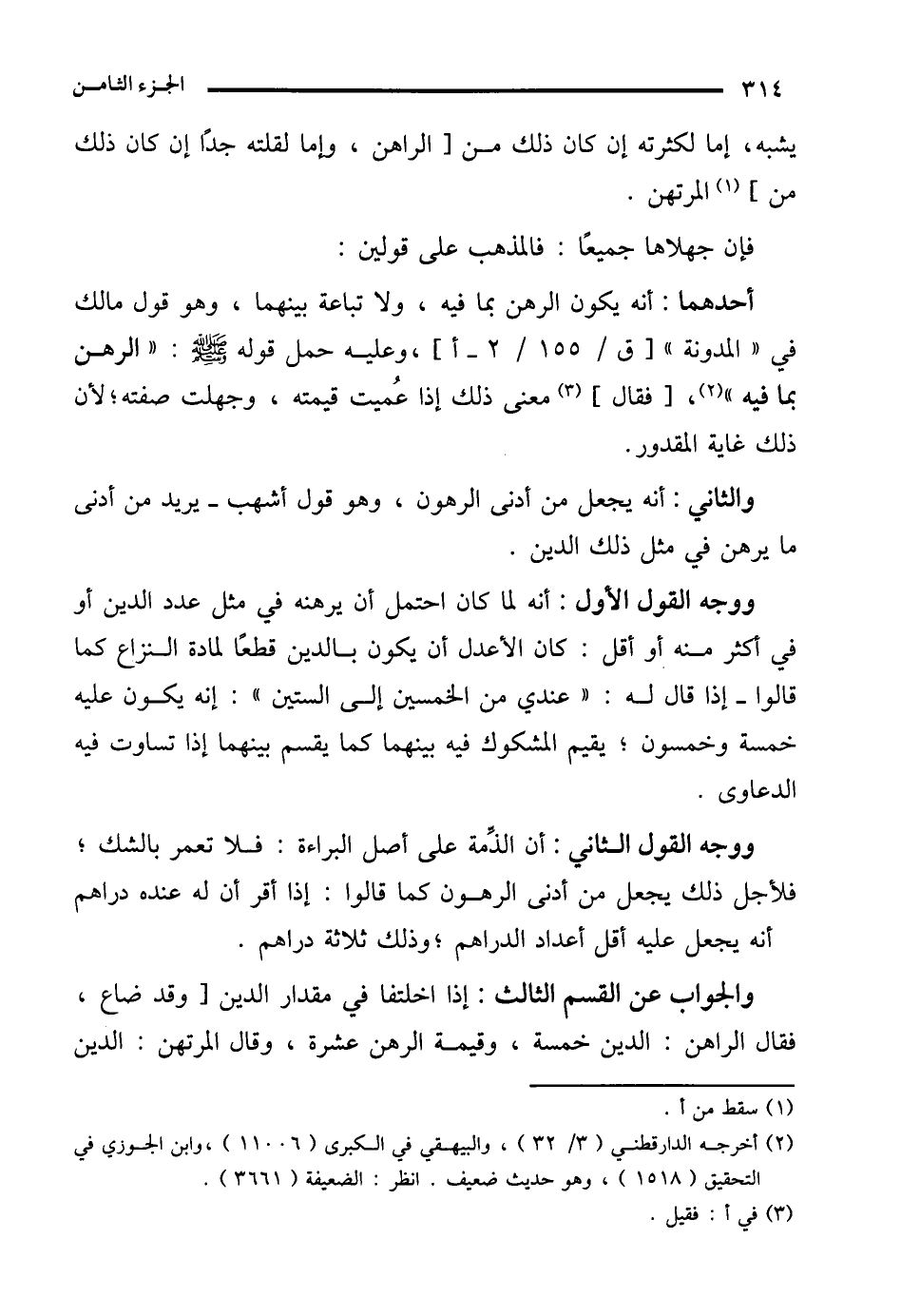 ووجه القول الثاني: أن الذِّمة على أصل البراءة: فلا تعمر بالشك؛ فلأجل ذلك يجعل من أدنى الرهون كما قالوا: إذا أقر أن له عنده دراهم أنه يجعل عليه أقل أعداد الدراهم؛ وذلك ثلاثة دراهم.