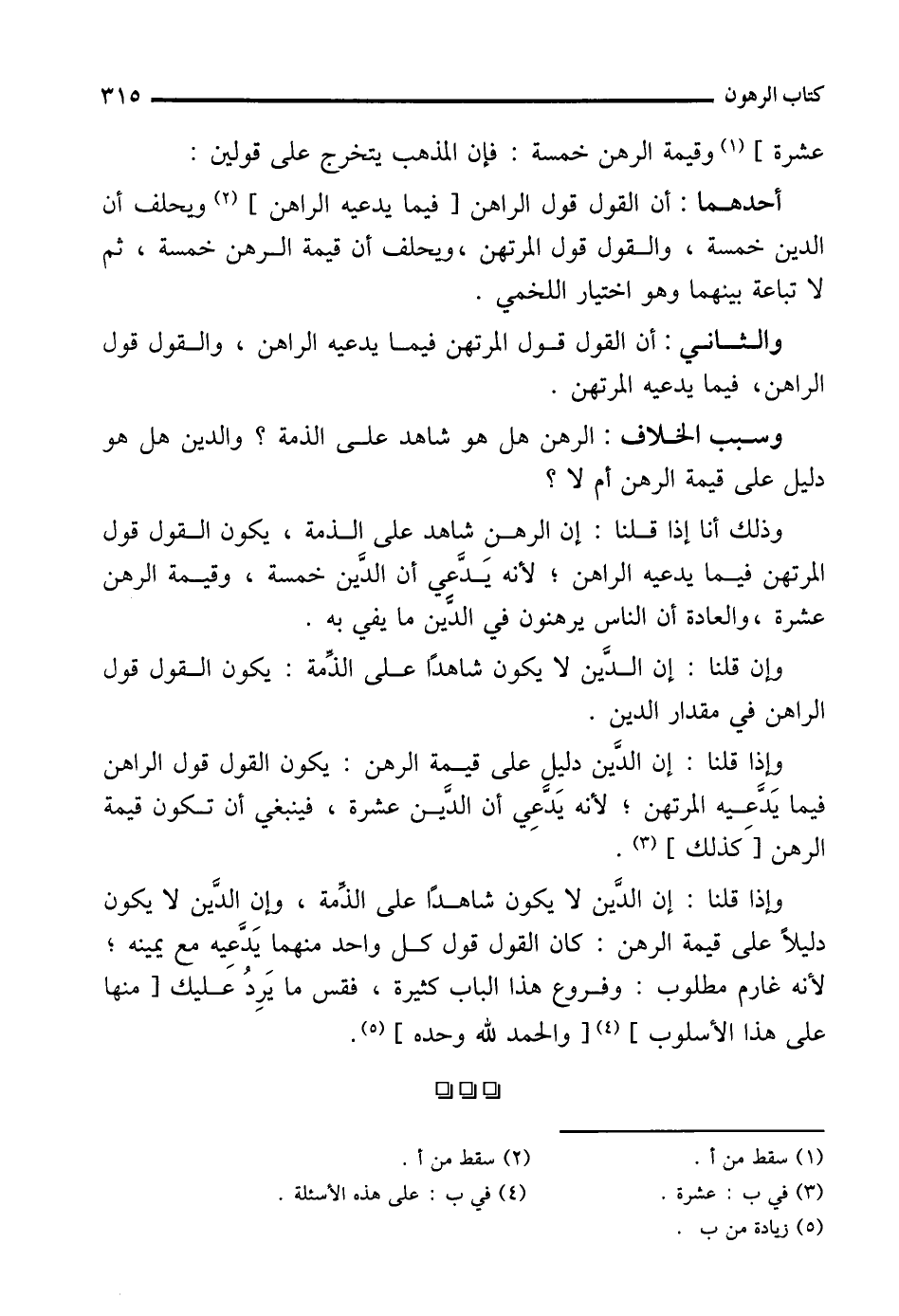 وإذا قلنا: إن الدَّين لا يكون شاهدًا على الذَّمة، وإن الدَّين لا يكون دليلًا على قيمة الرهن: كان القول قول كل واحد منهما يَدَّعيه مع يمينه؛ لأنه غارم مطلوب: وفروع هذا الباب كثيرة، فقس ما يَرِدُ عَليك [منها على هذا الأسلوب] (¬4) [والحمد لله وحده] (¬5).