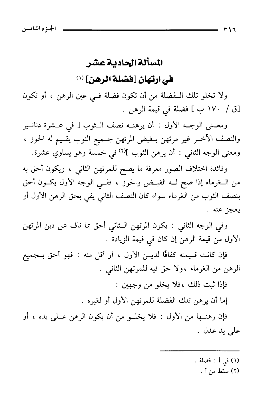 المسألة الحادية عشر في ارتهان [فضلة الرهن] (¬1)