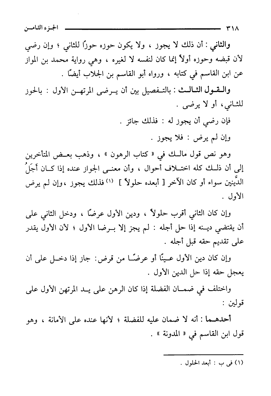 وهو نص قول مالك في "كتاب الرهون"، وذهب بعض المتأخرين إلى أن ذلك كله اختلاف أحوال، وأن معنى الجواز عنده إذا كان أَجَلُ الدَّينين سواء أو كان الآخر [أبعده حلولًا] (¬1) فذلك يجوز، وإن لم يرض الأول.
