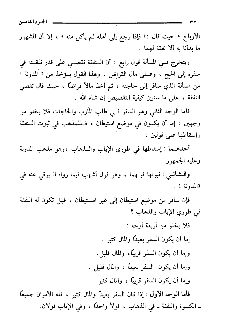 فأما الوجه الأول: إذا كان السفر بعيدًا والمال كثير، فله الأمران جميعًا -الكسوة والنفقة- في الذهاب، قولًا واحدًا، وفي الإياب قولان: