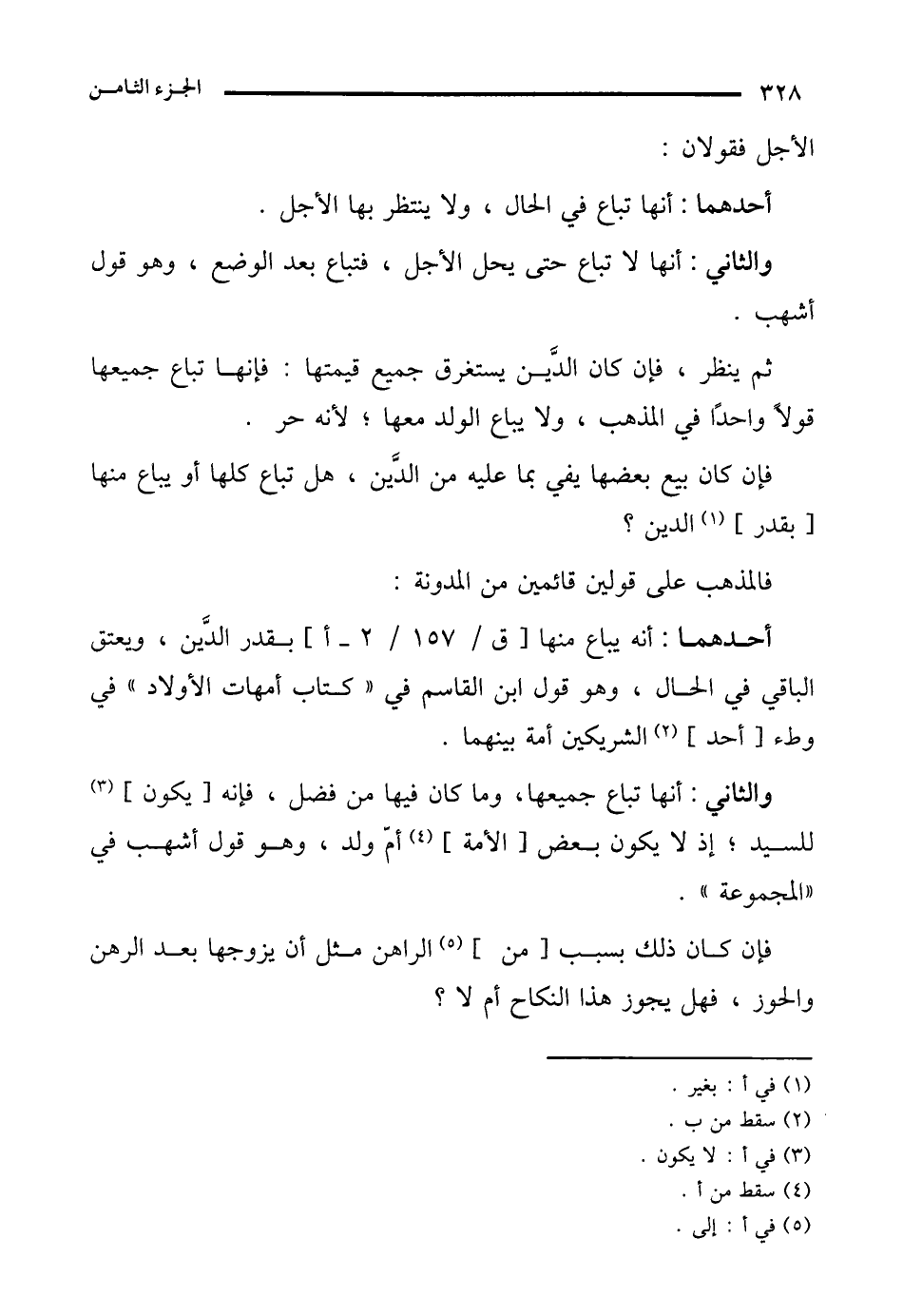 والثاني: أنها تباع جميعها، وما كان فيها من فضل، فإنه [يكون] (¬3) للسيد؛ إذ لا يكون بعض [الأمة] (¬4) أمّ ولد، وهو قول أشهب في "المجموعة".