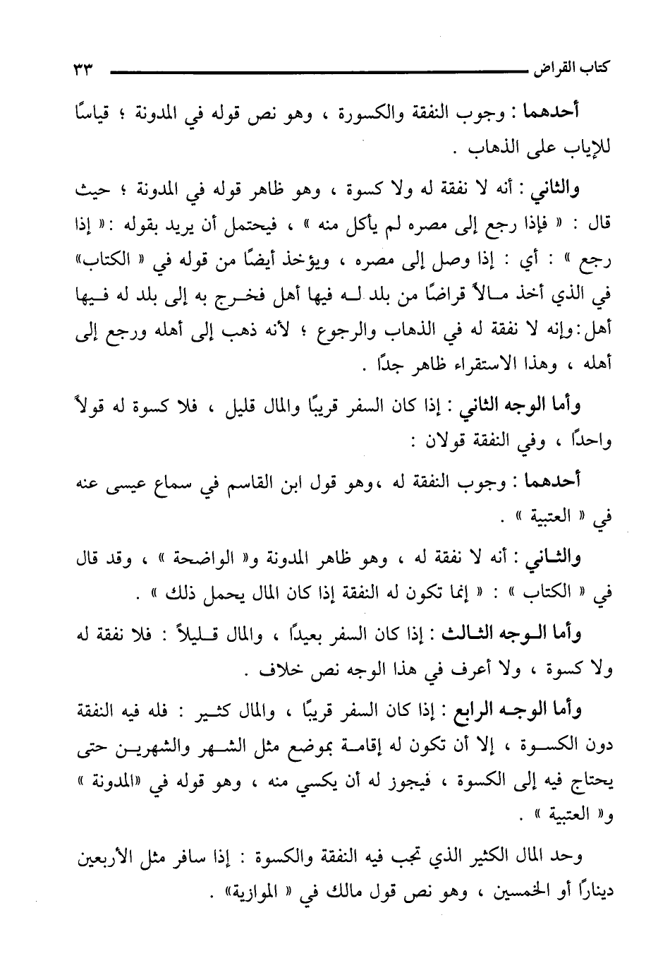 والثاني: أنه لا نفقة له ولا كسوة، وهو ظاهر قوله في المدونة؛ حيث قال: "فإذا رجع إلى مصره لم يأكل منه"، فيحتمل أن يريد بقوله: "إذا رجع": أي: إذا وصل إلى مصره، ويؤخذ أيضًا من قوله في "الكتاب" في الذي أخذ مالًا قراضًا من بلد له فيها أهل فخرج به إلى بلد له فيها أهل: وإنه لا نفقة له في الذهاب والرجوع؛ لأنه ذهب إلى أهله ورجع إلى أهله، وهذا الاستقراء ظاهر جدًا.