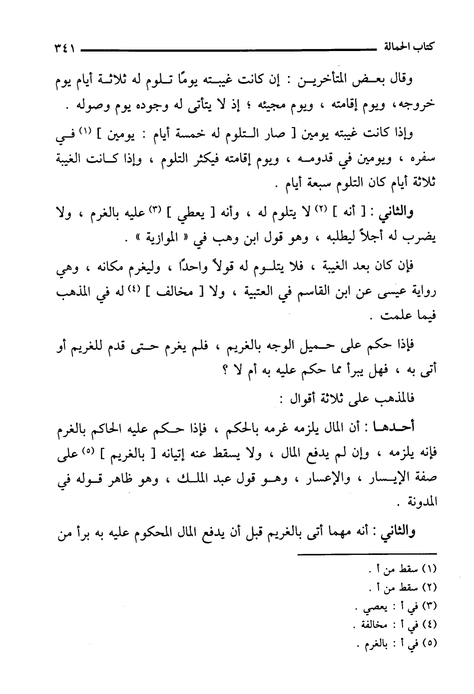وقال بعض المتأخرين: إن كانت غيبته يومًا تلوم له ثلاثة أيام يوم خروجه، ويوم إقامته، ويوم مجيئه؛ إذ لا يتأتى له وجوده يوم وصوله.