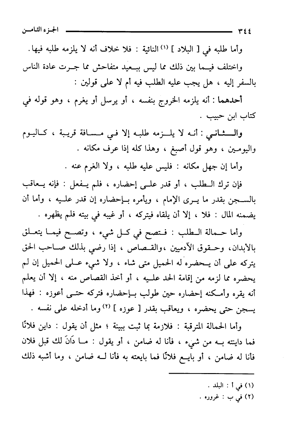 والثاني: أنه لا يلزمه طلبه إلا في مسافة قريبة، كاليوم واليومين، وهو قول أصبغ، وهذا كله إذا عرف مكانه.