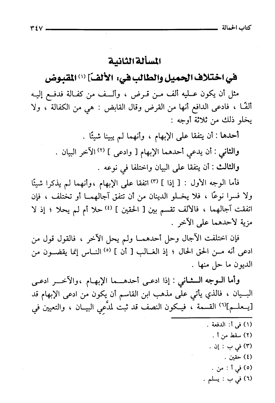 المسألة الثانية في اختلاف الحميل والطالب في: الألفّ] (¬1) المقبوض
