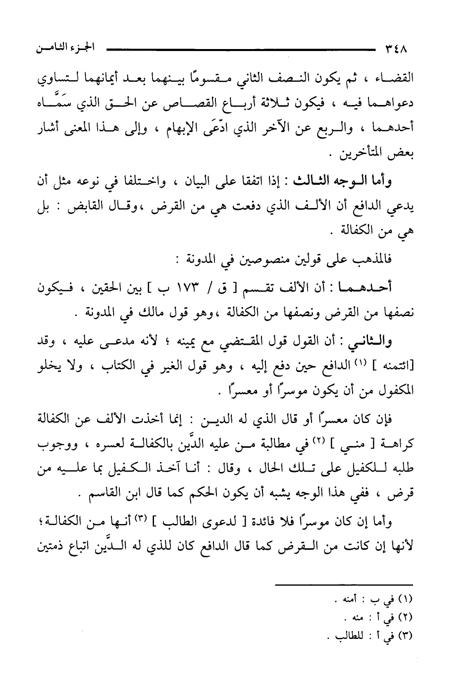 فإن كان معسرًا أو قال الذي له الدين: إنما أخذت الألف عن الكفالة كراهة [مني] (¬2) في مطالبة من عليه الدَّين بالكفالة لعسره، ووجوب طلبه للكفيل على تلك الحال، وقال: أنا آخذ الكفيل بما عليه من قرض، ففي هذا الوجه يشبه أن يكون الحكم كما قال ابن القاسم.