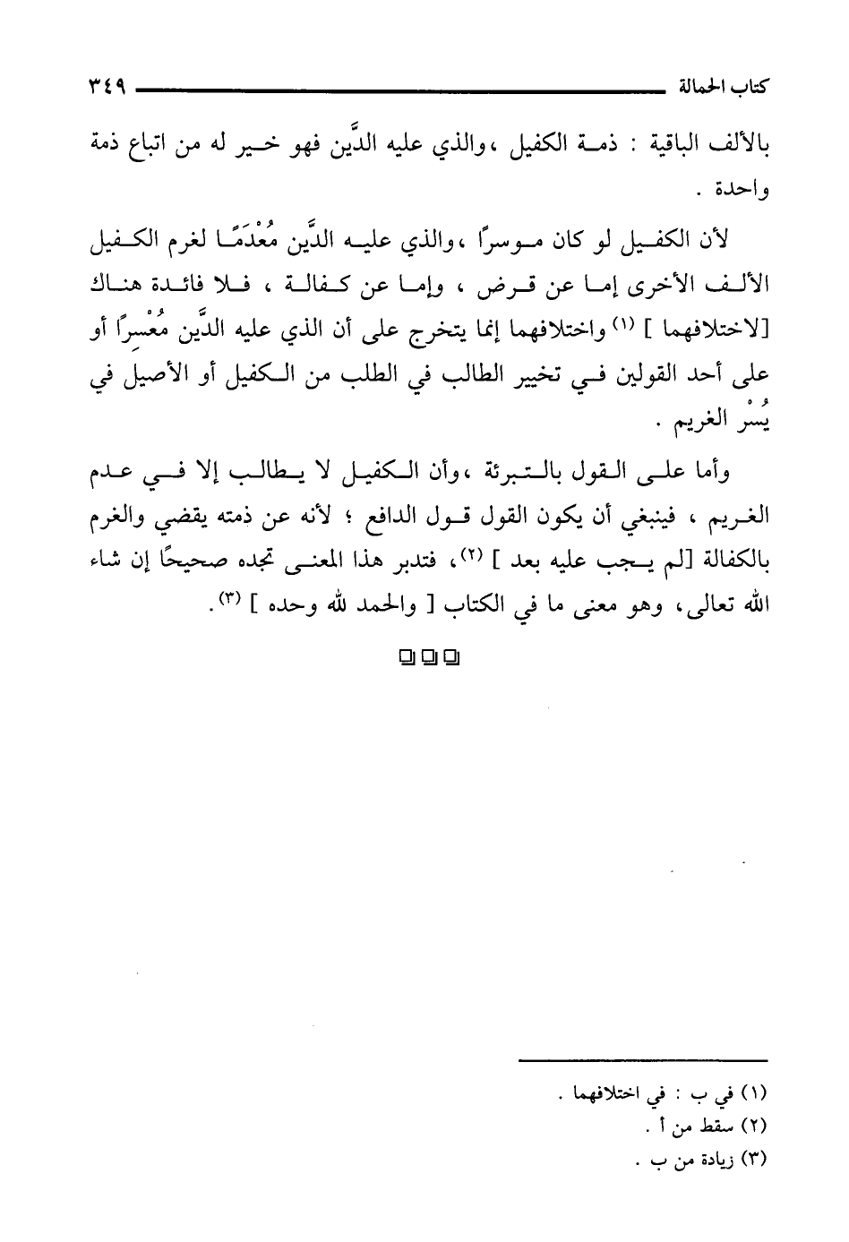 وأما على القول بالتبرئة، وأن الكفيل لا يطالب إلا في عدم الغريم، فينبغي أن يكون القول قول الدافع؛ لأنه عن ذمته يقضي والغرم بالكفالة [لم يجب عليه بعد] (¬2)، فتدبر هذا المعنى تجده صحيحًا إن شاء الله تعالى، وهو معنى ما في الكتاب [والحمد لله وحده] (¬3).