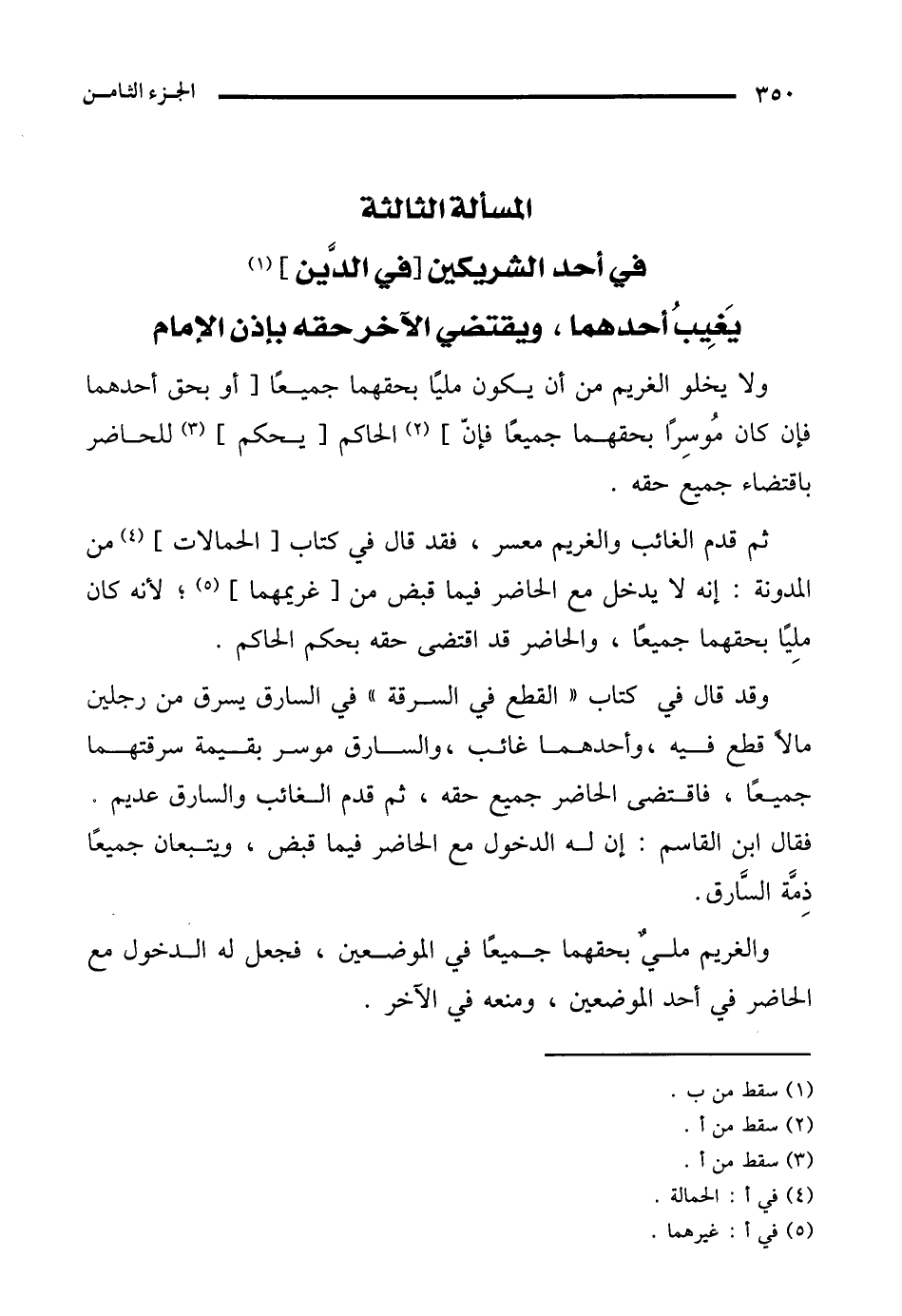 المسألة الثالثة في أحد الشريكين [في الدَّين] (¬1) يَغِيبُ أحدهما، ويقتضي الآخر حقه بإذن الإمام