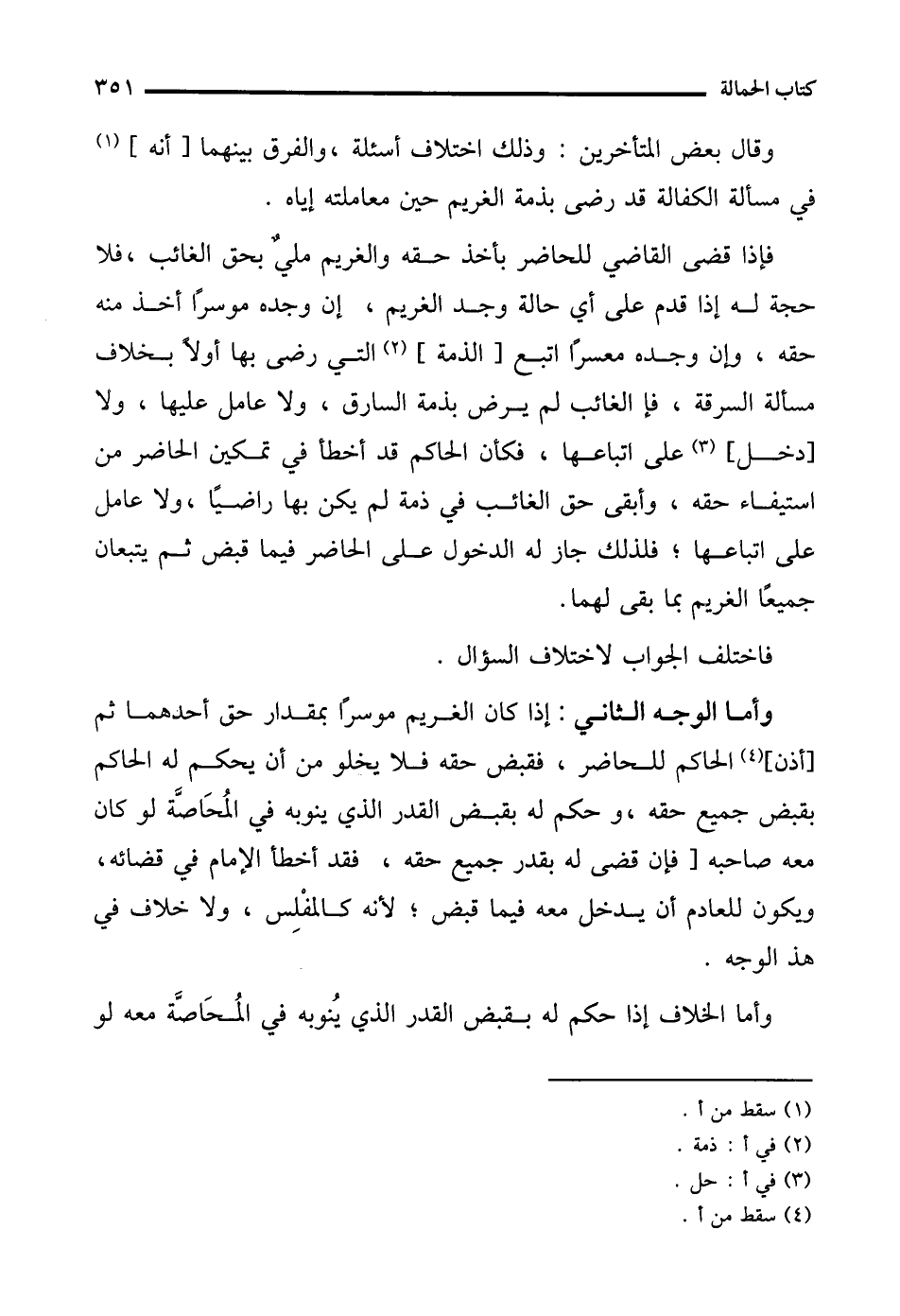 فإذا قضى القاضي للحاضر بأخذ حقه والغريم مليٌ بحق الغائب، فلا حجة له إذا قدم على أي حالة وجد الغريم، إن وجده موسرًا أخذ منه حقه، وإن وجده معسرًا اتبع [الذمة] (¬2) التي رضي بها أولًا بخلاف مسألة السرقة، فإن الغائب لم يرض بذمة السارق، ولا عامل عليها, ولا [دخل] (¬3) على اتباعها، فكأن الحاكم قد أخطأ في تمكين الحاضر من استيفاء حقه، وأبقى حق الغائب في ذمة لم يكن بها راضيًا, ولا عامل على اتباعها؛ فلذلك جاز له الدخول على الحاضر فيما قبض ثم يتبعان جميعًا الغريم بما بقى لهما.