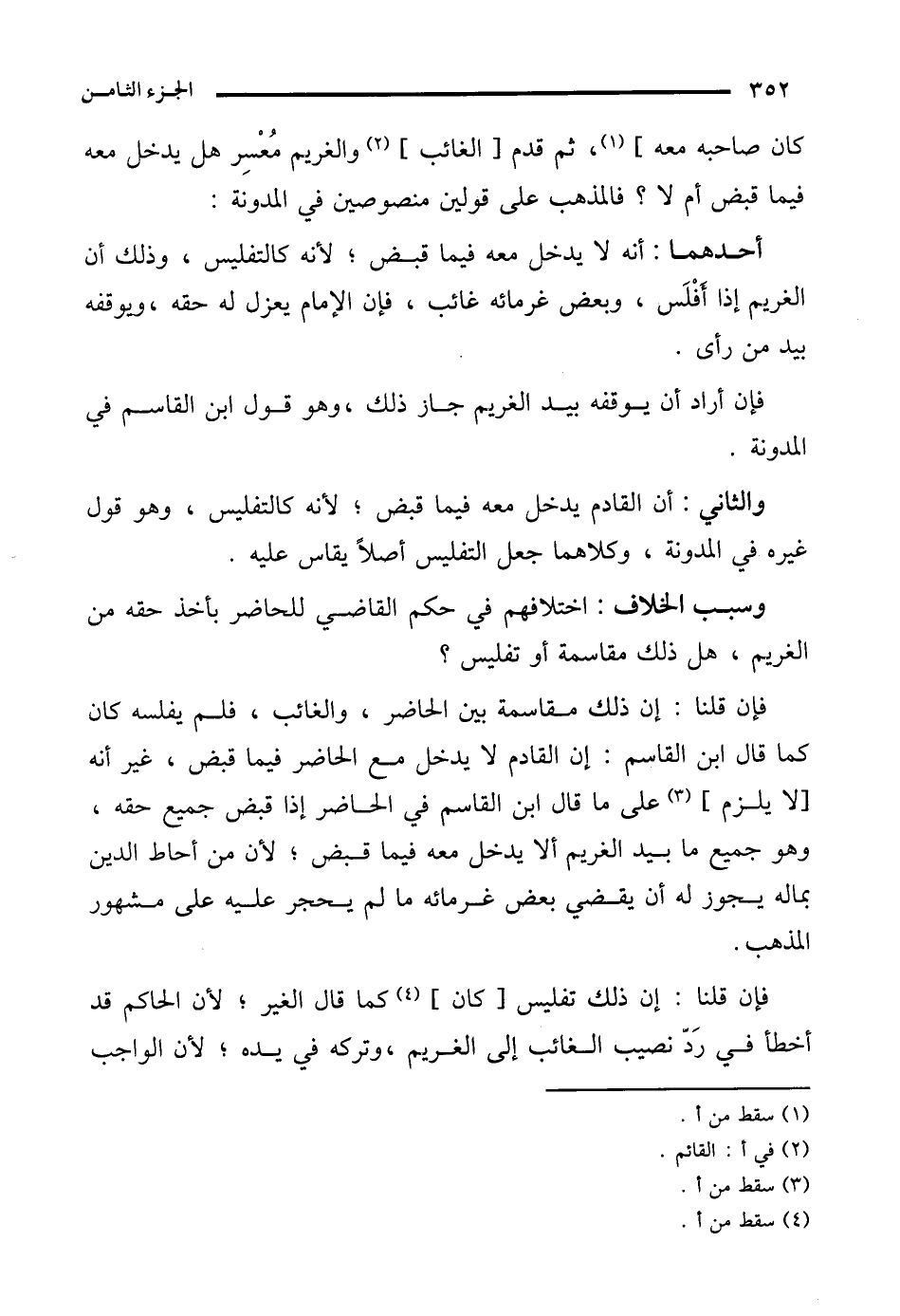وسبب الخلاف: اختلافهم في حكم القاضي للحاضر بأخذ حقه من الغريم، هل ذلك مقاسمة أو تفليس؟