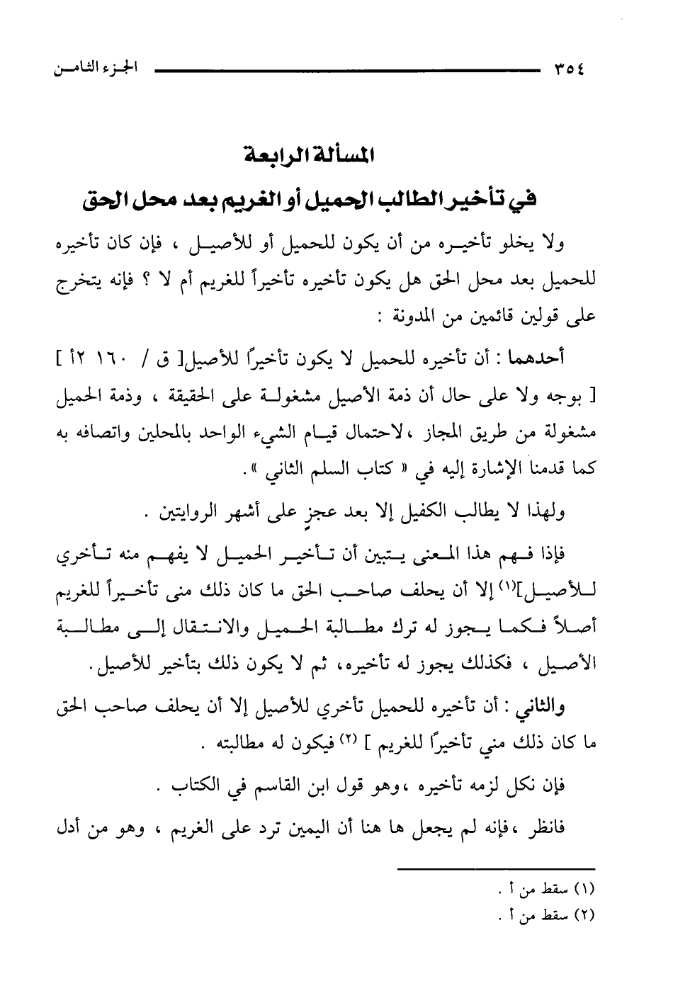 المسألة الرابعة في تأخير الطالب الحميل أو الغريم بعد محل الحق