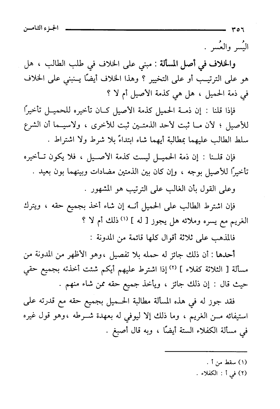 والخلاف في أصل المسألة: مبني على الخلاف في طلب الطالب، هل هو على الترتيب أو على التخيير؟ وهذا الخلاف أيضًا ينبني على الخلاف في ذمة الحميل، هل هي كذمة الأصيل أم لا؟