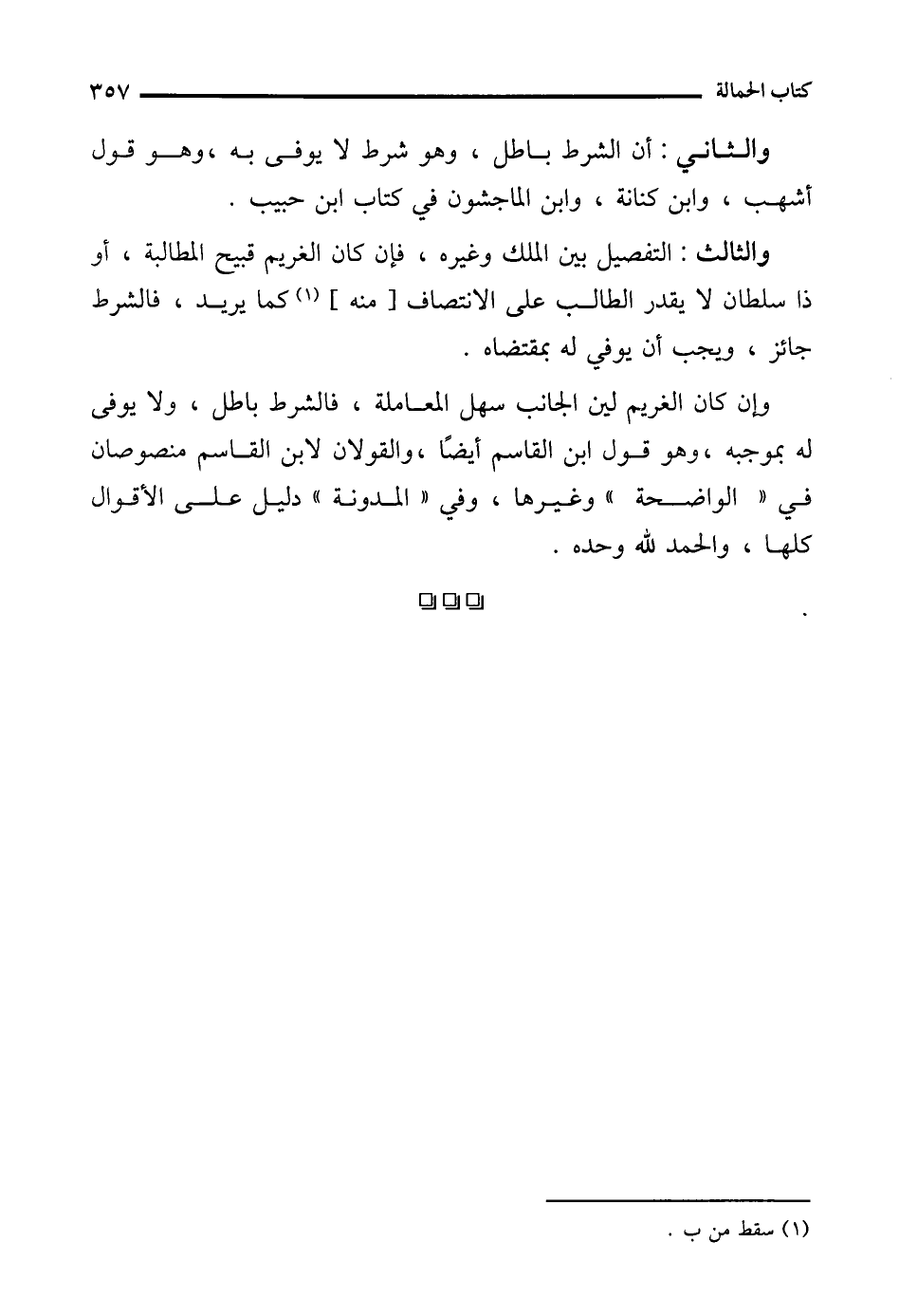 وإن كان الغريم في الجانب سهل المعاملة، فالشرط باطل، ولا يوفى له بموجبه، وهو قول ابن القاسم أيضًا، والقولان لابن القاسم منصوصان في "الواضحة" وغيرها، وفي "المدونة" دليل على الأقوال كلها، والحمد لله وحده.