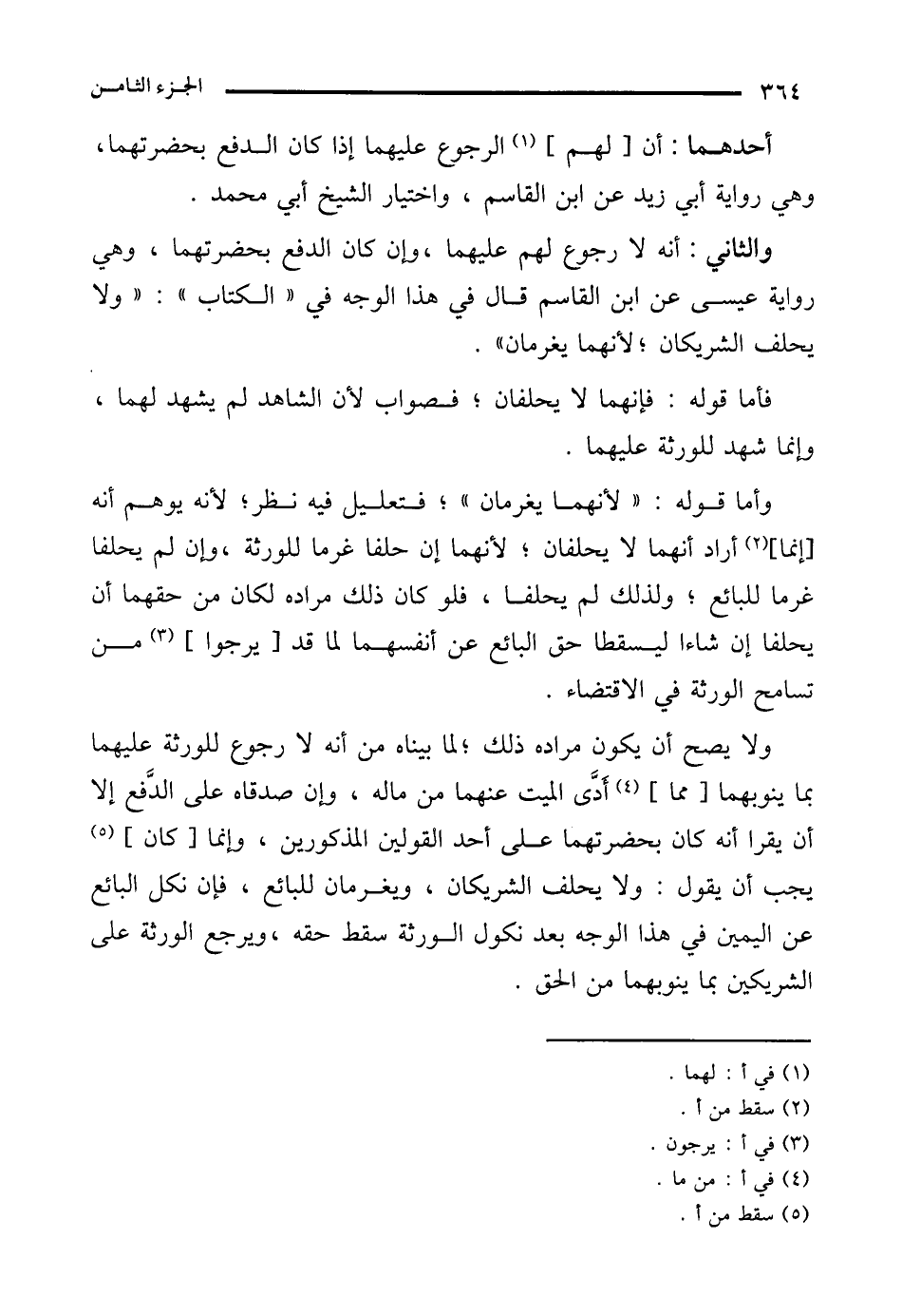 ولا يصح أن يكون مراده ذلك؛ لما بيناه من أنه لا رجوع للورثة عليهما بما ينوبهما [مما] (¬4) أَدَّى الميت عنهما من ماله، وإن صدقاه على الدَّفع إلا أن يقرأ أنه كان بحضرتهما على أحد القولين المذكورين، وإنما [كان] (¬5) يجب أن يقول: ولا يحلف الشريكان، ويغرمان للبائع، فإن نكل البائع عن اليمين في هذا الوجه بعد نكول الورثة سقط حقه، ويرجع الورثة على الشريكين بما ينوبهما من الحق.