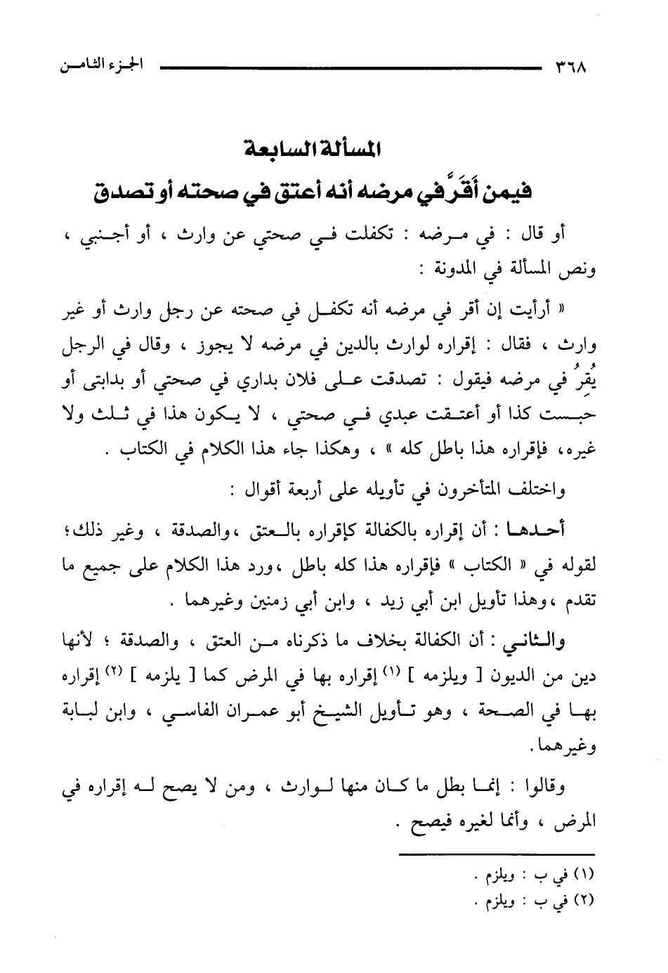 "أرأيت إن أقر في مرضه أنه تكفل في صحته عن رجل وارث أو غير وارث، فقال: إقراره لوارث بالدين في مرضه لا يجوز، وقال في الرجل يُقِرُ في مرضه فيقول: تصدقت على فلان بداري في صحتي أو بدابتى أو حبست كذا أو أعتقت عبدي في صحتي، لا يكون هذا في ثلث ولا غيره، فإقراره هذا باطل كله"، وهكذا جاء هذا الكلام في الكتاب.