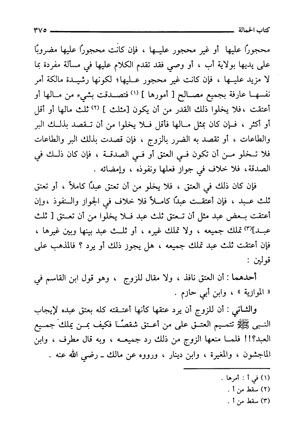 فإن كان ذلك في العتق، فلا يخلو من أن تعتق عبدًا كاملًا، أو تعتق ثلث عبد، فإن أعتقت عبدًا كاملًا فلا خلاف في الجواز والنفوذ، وإن أعتقت بعض عبد مثل أن تعتق ثلث عبد فلا يخلو من أن تعتق [ثلث عبد] (¬3) تملك جميعه، ولا تملك غيره، أو ثلث عبد بينها وبين غيرها، فإن أعتقت ثلث عبد تملك جميعه، هل يجوز ذلك أو يرد؟ فالمذهب على قولين: