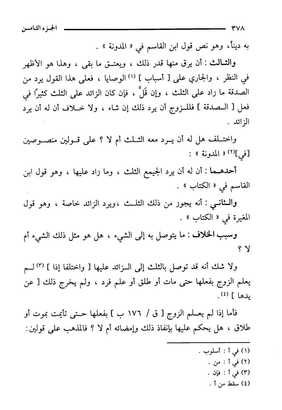 والثالث: أن يرق منها قدر ذلك، ويعتق ما بقى، وهذا هو الأظهر في النظر، والجاري على [أسباب] (¬1) الوصايا، فعلى هذا القول يرد من الصدقة ما زاد على الثلث، وإن قَلَّ، فإن كان الزائد على الثلث كثيرًا في فعل [الصدقة] فللزوج أن يرد ذلك إن شاء، ولا خلاف أن له أن يرد الزائد.