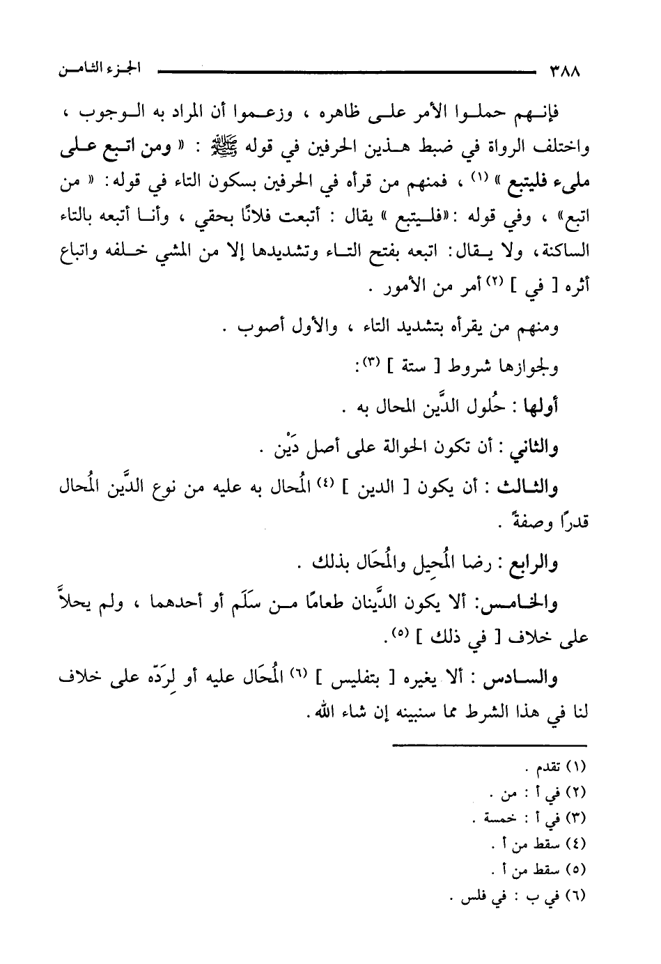 فإنهم حملوا الأمر على ظاهره، وزعموا أن المراد به الوجوب، واختلف الرواة في ضبط هذين الحرفين في قوله - صلى الله عليه وسلم -: "ومن اتبع على ملىء فليتبع" (¬1)، فمنهم من قرأه في الحرفين بسكون التاء في قوله: "من اتبع"، وفي قوله: "فليتبع" يقال: أتبعت فلانًا بحقي، وأنا أتبعه بالتاء الساكنة، ولا يقال: اتبعه بفتح التاء وتشديدها إلا من المشي خلفه واتباع أثره [في] (¬2) أمر من الأمور.
