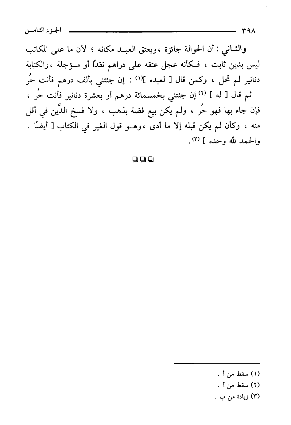 والثاني: أن الحوالة جائزة، ويعتق العبد مكانه؛ لأن ما على المكاتب ليس بدين ثابت، فكأنه عجل عتقه على دراهم نقدًا أو مؤجلة، والكتابة دنانير لم تحل، وكمن قال [لعبده] (¬1): إن جئتني بألف درهم فأنت حُر ثم قال [له] (¬2) إن جئتني بخمسمائة درهم أو بعشرة دنانير فأنت حُر، فإن جاء بها فهو حُر، ولم يكن بيع فضة بذهب، ولا فسخ الدَّين في أقل منه، وكأن لم يكن قبله إلا ما أدى، وهو قول الغير في الكتاب [أيضًا. والحمد لله وحده] (¬3).