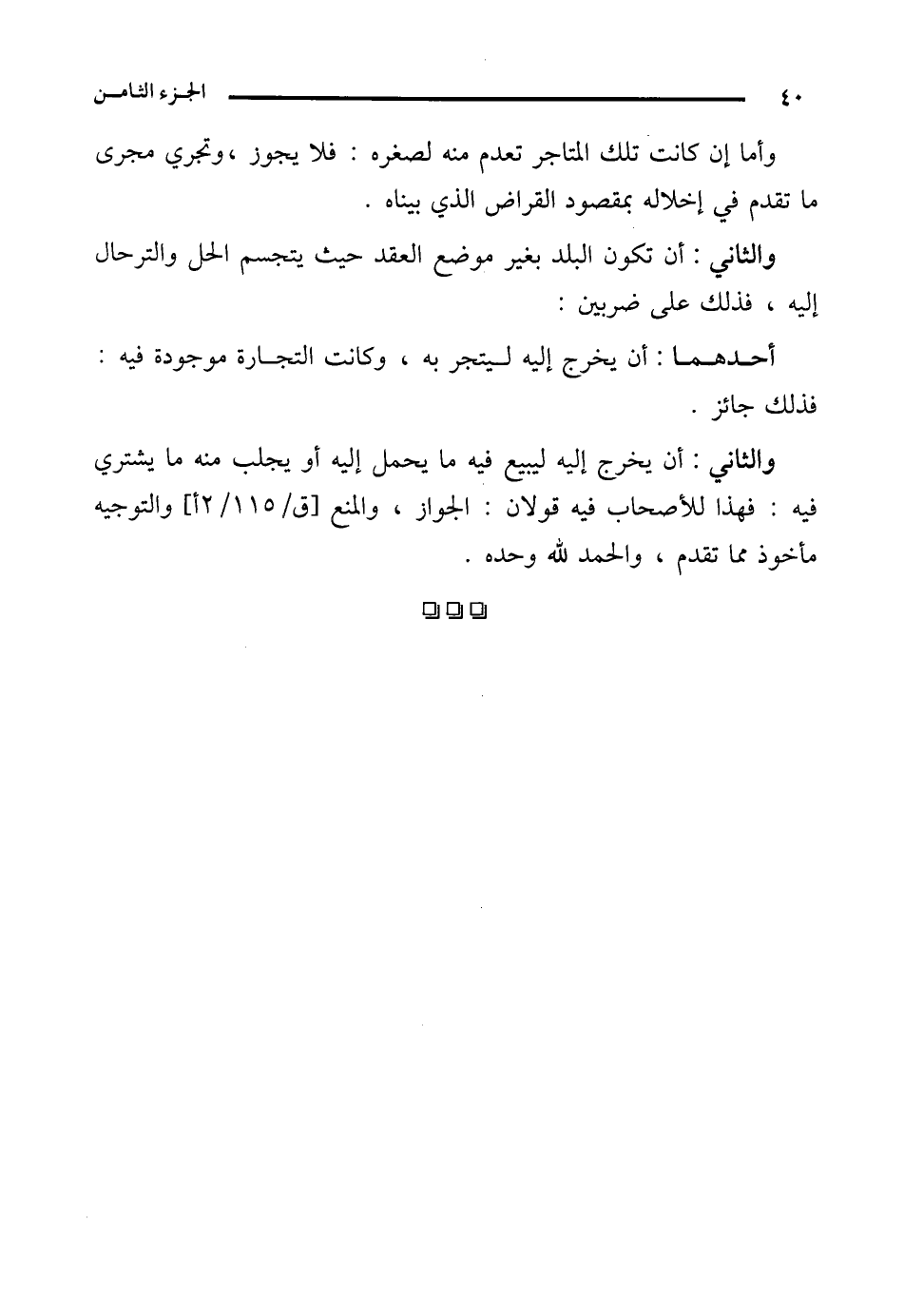 والثاني: أن يخرج إليه ليبيع فيه ما يحمل إليه أو يجلب منه ما يشتري فيه: فهذا للأصحاب فيه قولان: الجواز، والمنع والتوجيه مأخوذ مما تقدم، والحمد لله وحده.