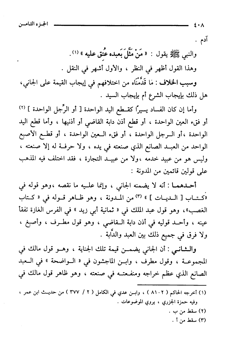 والثاني: أن الجاني يضمن قيمة تلك الجناية، وهو قول مالك في المجموعة، وقول مطرف، وابن الماجشون في "الواضحة" في العبد الصانع الذي عظم خراجه ومنفعته في صنعته، وهو ظاهر قول مالك في