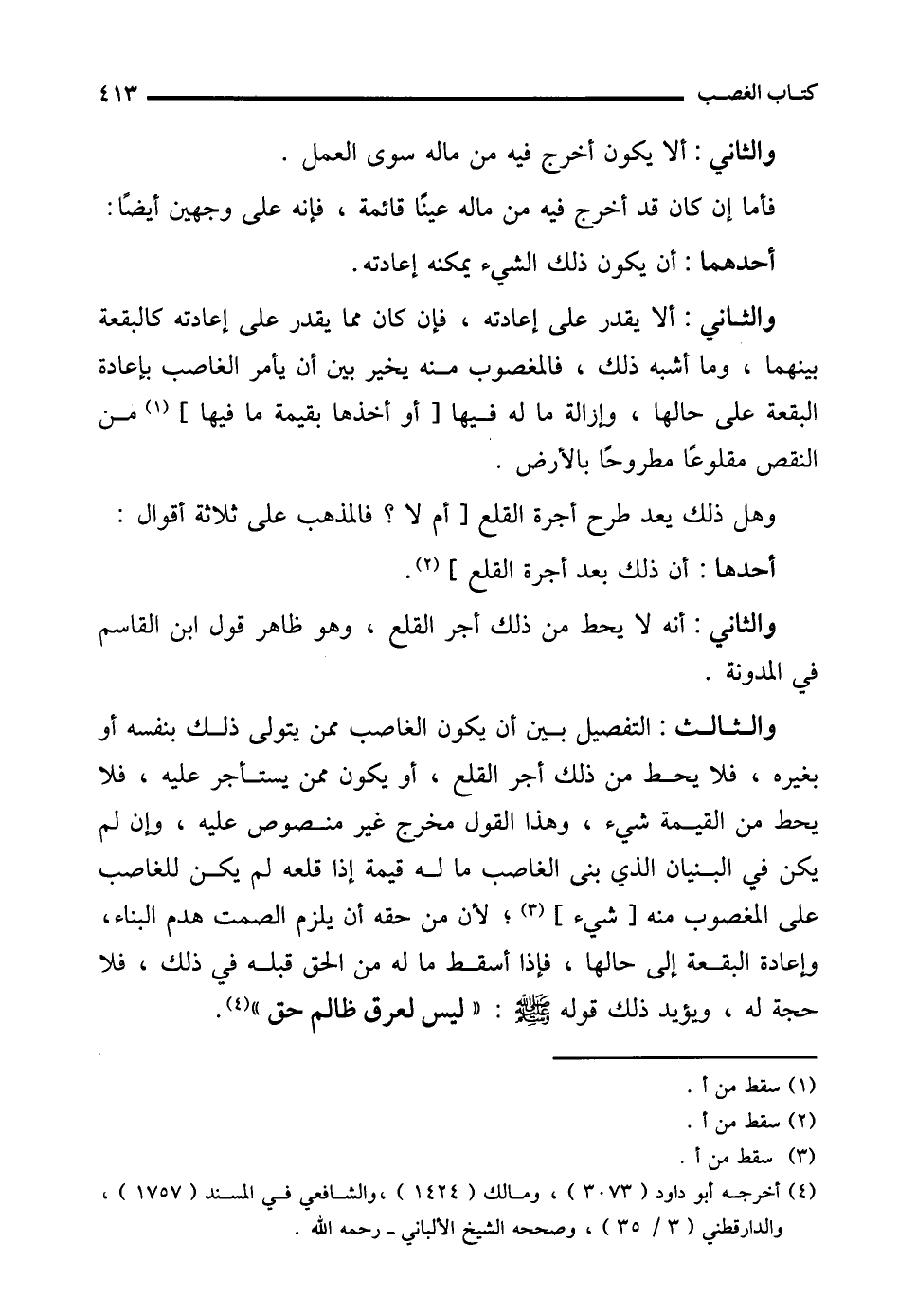 والثالث: التفصيل بين أن يكون الغاصب ممن يتولى ذلك بنفسه أو بغيره، فلا يحط من ذلك أجر القلع، أو يكون ممن يستأجر عليه، فلا يحط من القيمة شيء، وهذا القول مخرج غير منصوص عليه، وإن لم يكن في البنيان الذي بني الغاصب ما له قيمة إذا قلعه لم يكن للغاصب على المغصوب منه [شيء] (¬3)؛ لأن من حقه أن يلزم الصمت هدم البناء، وإعادة البقعة إلى حالها، فإذا أسقط ما له من الحق قبله في ذلك، فلا حجة له، ويؤيد ذلك قوله - صلى الله عليه وسلم -: "ليس لعرق ظالم حق" (¬4).