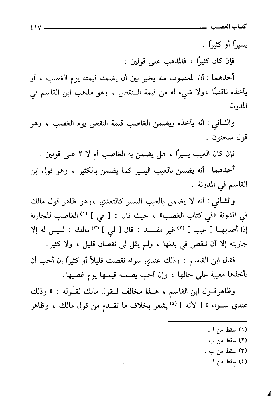 والثاني: أنه لا يضمن بالعيب اليسير كالتعدي، وهو ظاهر قول مالك في المدونة "في كتاب الغصب"، حيث قال: [في] (¬1) الغاصب للجارية إذا أصابها [عيب] (¬2) غير مفسد: قال [لي] (¬3) مالك: ليس له إلا جاريته إلا أن تنقص في بدنها، ولم يقل لي نقصان قليل، ولا كثير.