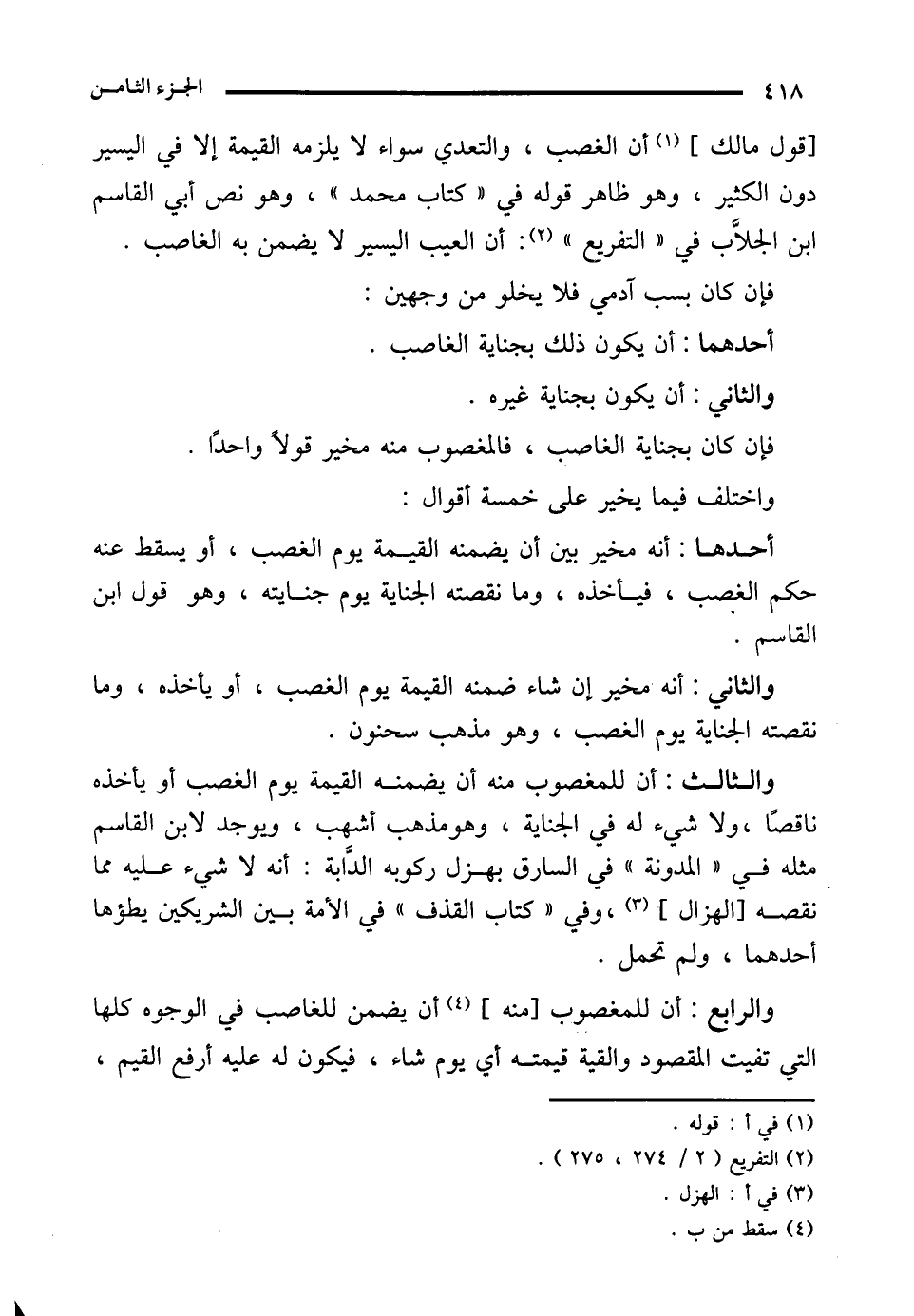 [قول مالك] (¬1) أن الغصب، والتعدي سواء لا يلزمه القيمة إلا في اليسير دون الكثير، وهو ظاهر قوله في "كتاب محمد"، وهو نص أبي القاسم ابن الجلَّاب في "التفريع" (¬2): أن العيب اليسير لا يضمن به الغاصب.