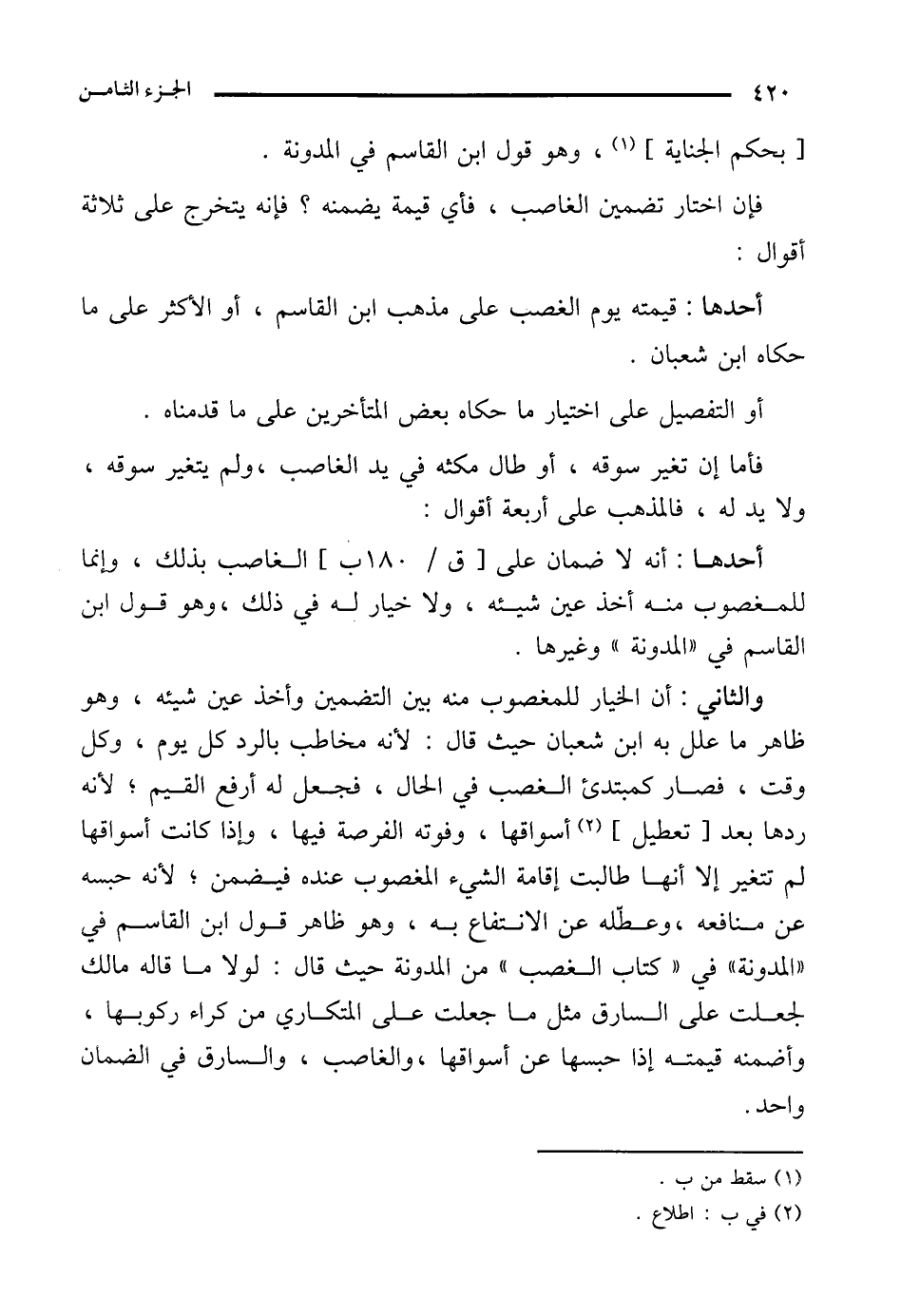 والثاني: أن الخيار للمغصوب منه بين التضمين وأخذ عين شيئه، وهو ظاهر ما علل به ابن شعبان حيث قال: لأنه مخاطب بالرد كل يوم، وكل وقت، فصار كمبتدئ الغصب في الحال، فجعل له أرفع القيم؛ لأنه ردها بعد [تعطيل] (¬2) أسواقها، وفوته الفرصة فيها، وإذا كانت أسواقها لم تتغير إلا أنها طالبت إقامة الشيء المغصوب عنده فيضمن؛ لأنه حبسه عن منافعه، وعطّله عن الانتفاع به، وهو ظاهر قول ابن القاسم في "المدونة" في "كتاب الغصب" من المدونة حيث قال: لولا ما قاله مالك لجعلت على السارق مثل ما جعلت على المتكاري من كراء ركوبها، وأضمنه قيمته إذا حبسها عن أسواقها، والغاصب، والسارق في الضمان واحد.
