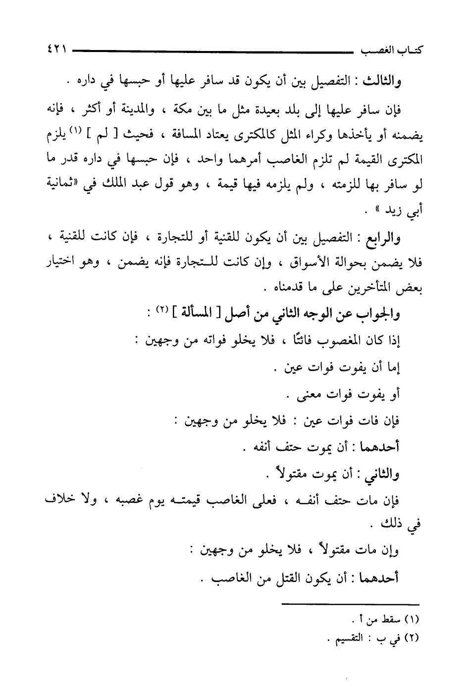 والرابع: التفصيل بين أن يكون للقنية أو للتجارة، فإن كانت للقنية، فلا يضمن بحوالة الأسواق، وإن كانت للتجارة فإنه يضمن، وهو اختيار بعض المتأخرين على ما قدمناه.