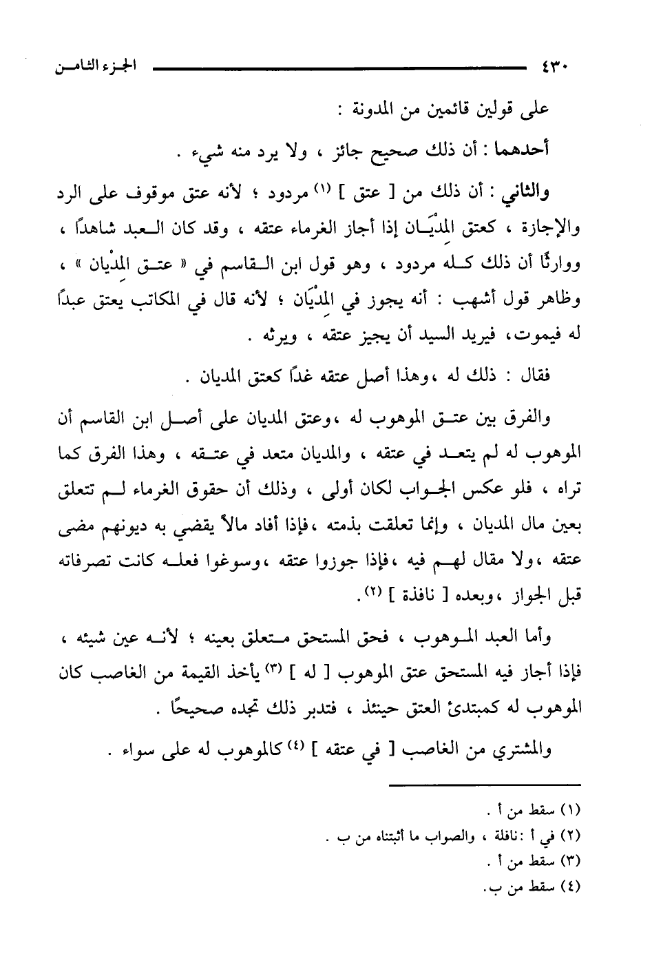 والفرق بين عتق الموهوب له، وعتق المديان على أصل ابن القاسم أن الموهوب له لم يتعد في عتقه، والمديان متعد في عتقه، وهذا الفرق كما تراه، فلو عكس الجواب لكان أولى، وذلك أن حقوق الغرماء لم تتعلق بعين مال المديان، وإنما تعلقت بذمته، فإذا أفاد مالًا يقضي به ديونهم مضى عتقه، ولا مقال لهم فيه، فإذا جوزوا عتقه، وسوغوا فعله كانت تصرفاته قبل الجواز، وبعده [نافذة] (¬2).