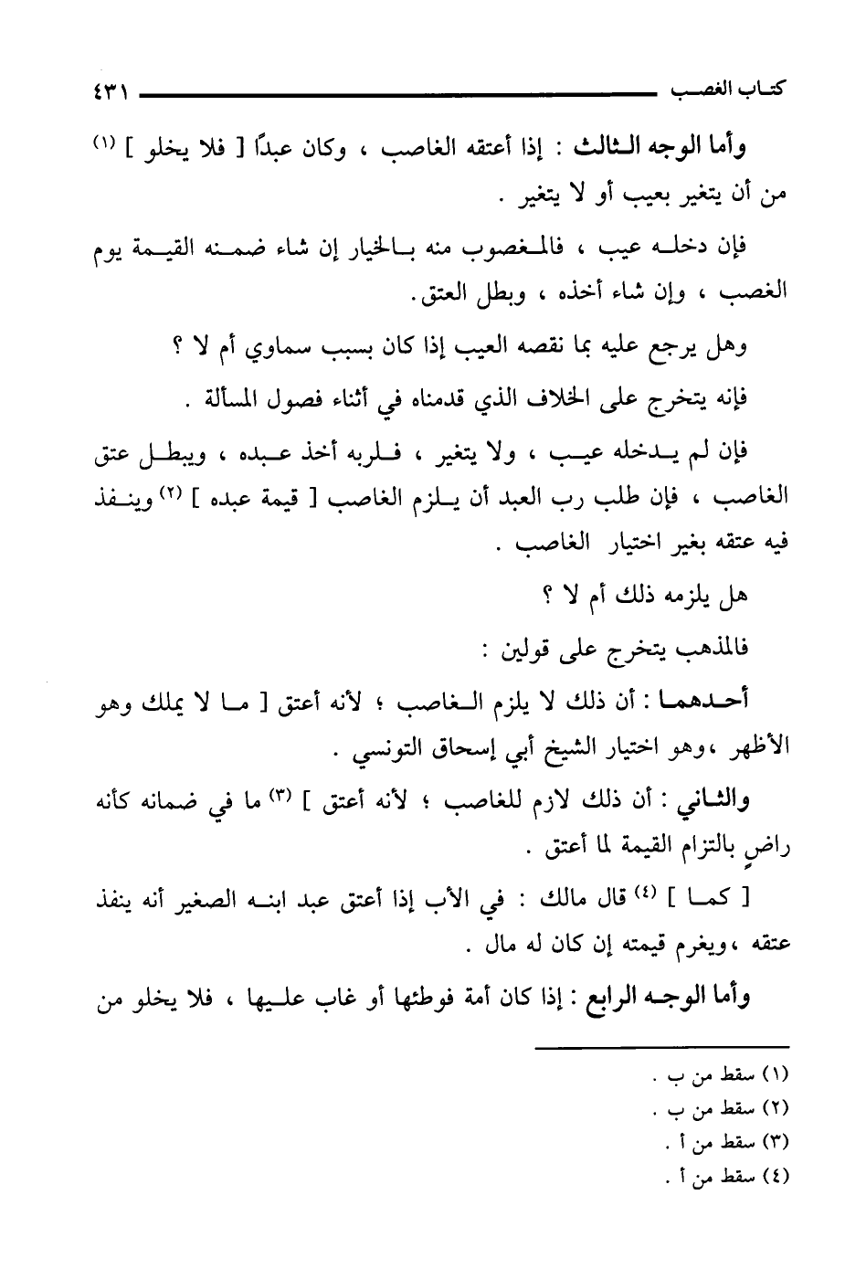 وأما الوجه الثالث: إذا أعتقه الغاصب، وكان عبدًا [فلا يخلو] (¬1) من أن يتغير بعيب أو لا يتغير.