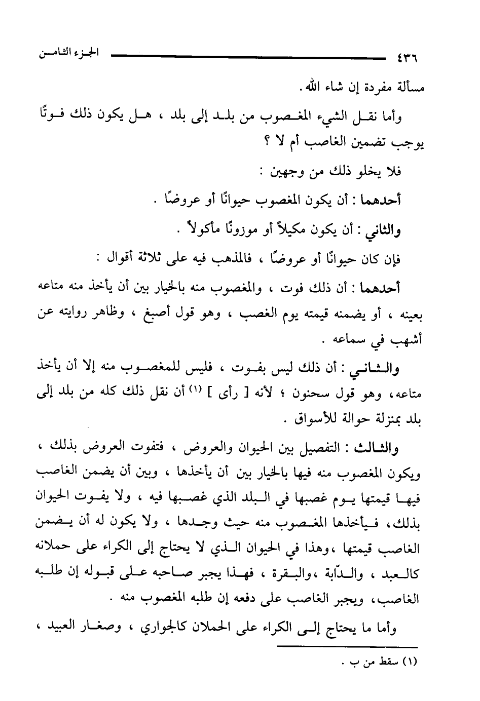 والثالث: التفصيل بين الحيوان والعروض، فتفوت العروض بذلك، ويكون المغصوب منه فيها بالخيار بين أن يأخذها، وبين أن يضمن الغاصب فيها قيمتها يوم غصبها في البلد الذي غصبها فيه، ولا يفوت الحيوان بذلك، فيأخذها المغصوب منه حيث وجدها, ولا يكون له أن يضمن الغاصب قيمتها، وهذا في الحيوان الذي لا يحتاج إلى الكراء على حملانه كالعبد، والدّابة، والبقرة، فهذا يجبر صاحبه على قبوله إن طلبه الغاصب، ويجبر الغاصب على دفعه إن طلبه المغصوب منه.
