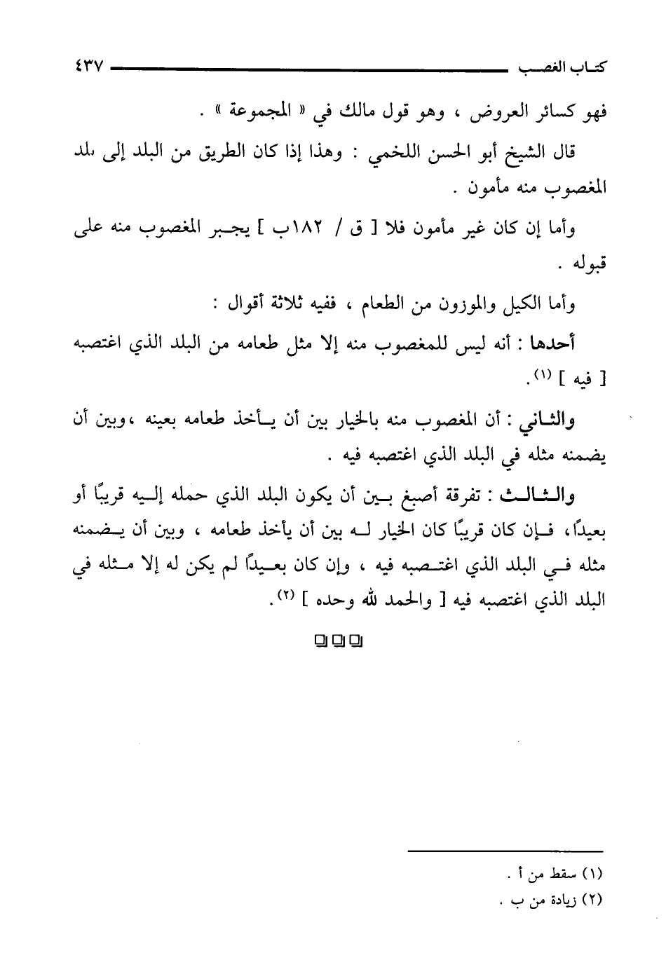 والثالث: تفرقة أصبغ بين أن يكون البلد الذي حمله إليه قريبًا أو بعيدًا، فإن كان قريبًا كان الخيار له بين أن يأخذ طعامه، وبين أن يضمنه مثله في البلد الذي اغتصبه فيه، وإن كان بعيدًا لم يكن له إلا مثله في البلد الذي اغتصبه فيه [والحمد لله وحده] (¬2).