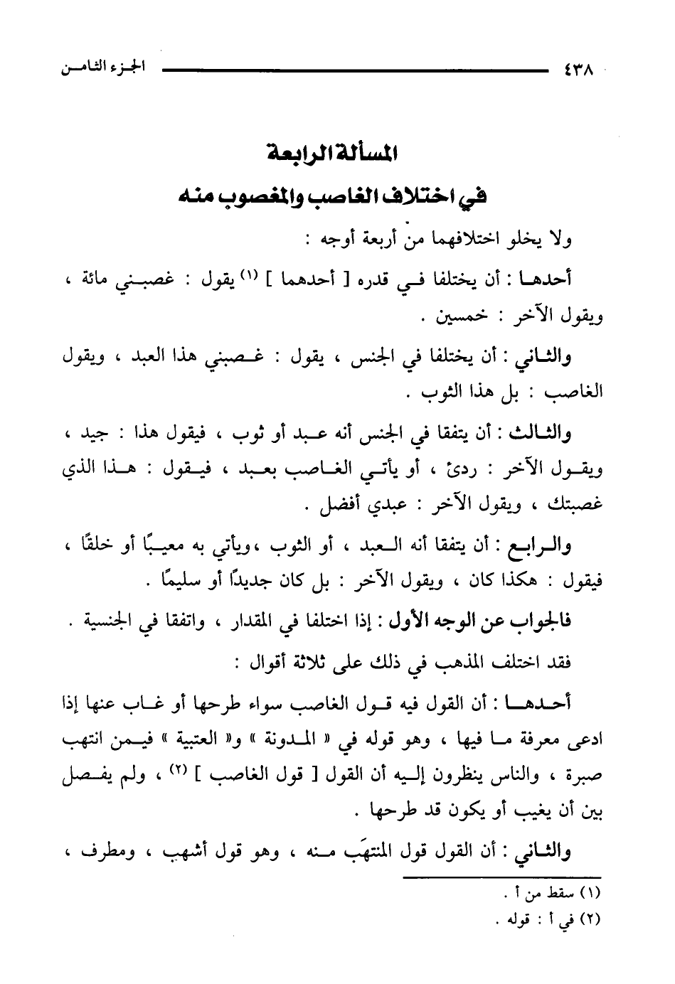 والثالث: أن يتفقا في الجنس أنه عبد أو ثوب، فيقول هذا: جيد، ويقول الآخر: ردئ، أو يأتي الغاصب بعبد، فيقول: هذا الذي غصبتك، ويقول الآخر: عبدي أفضل.