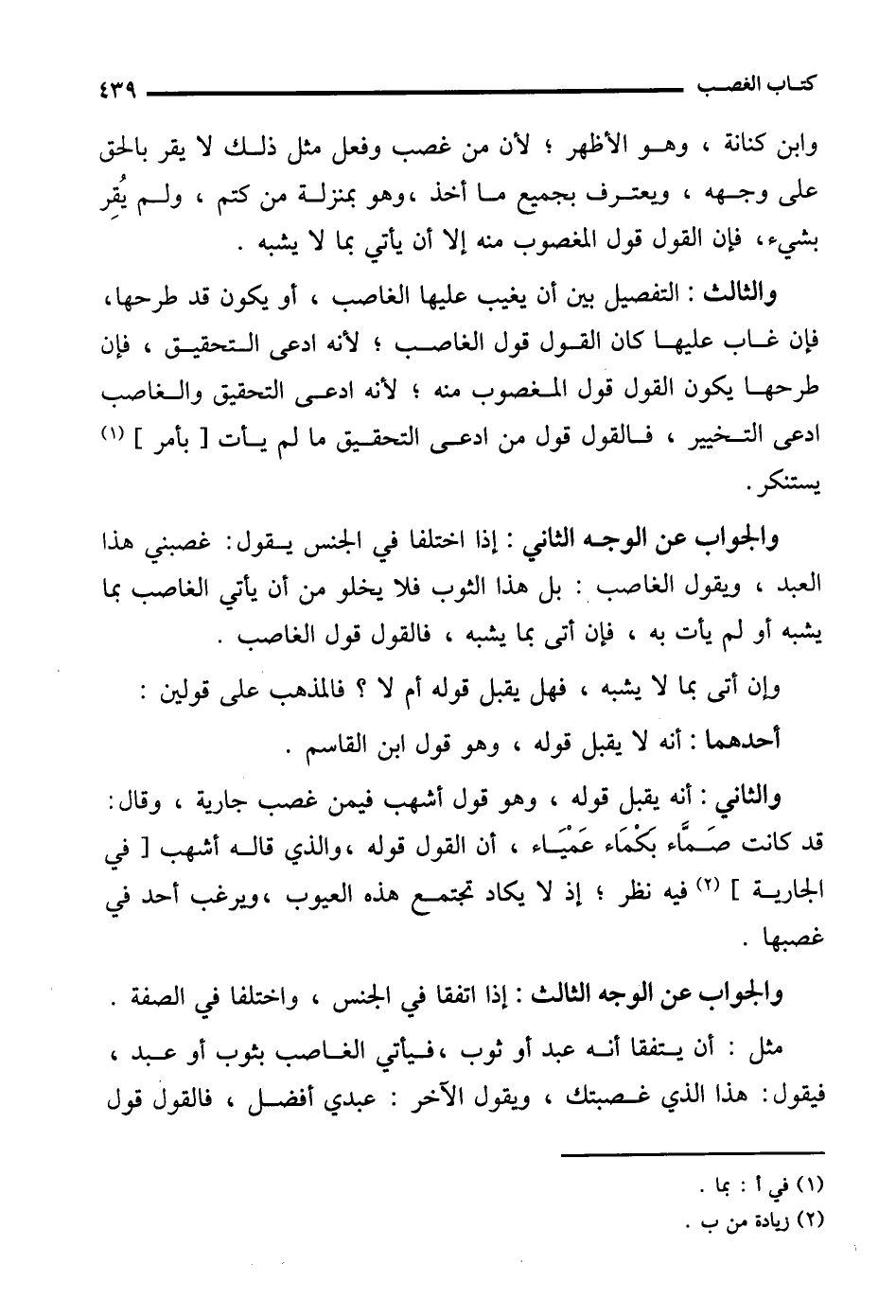 والجواب عن الوجه الثاني: إذا اختلفا في الجنس يقول: غصبني هذا العبد، ويقول الغاصب: بل هذا الثوب فلا يخلو من أن يأتي الغاصب بما يشبه أو لم يأت به، فإن أتى بما يشبه، فالقول قول الغاصب.