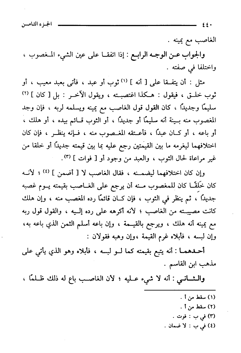 والجواب عن الوجه الرابع: إذا اتفقا على عين الشيء المغصوب، واختلفا في صفته.