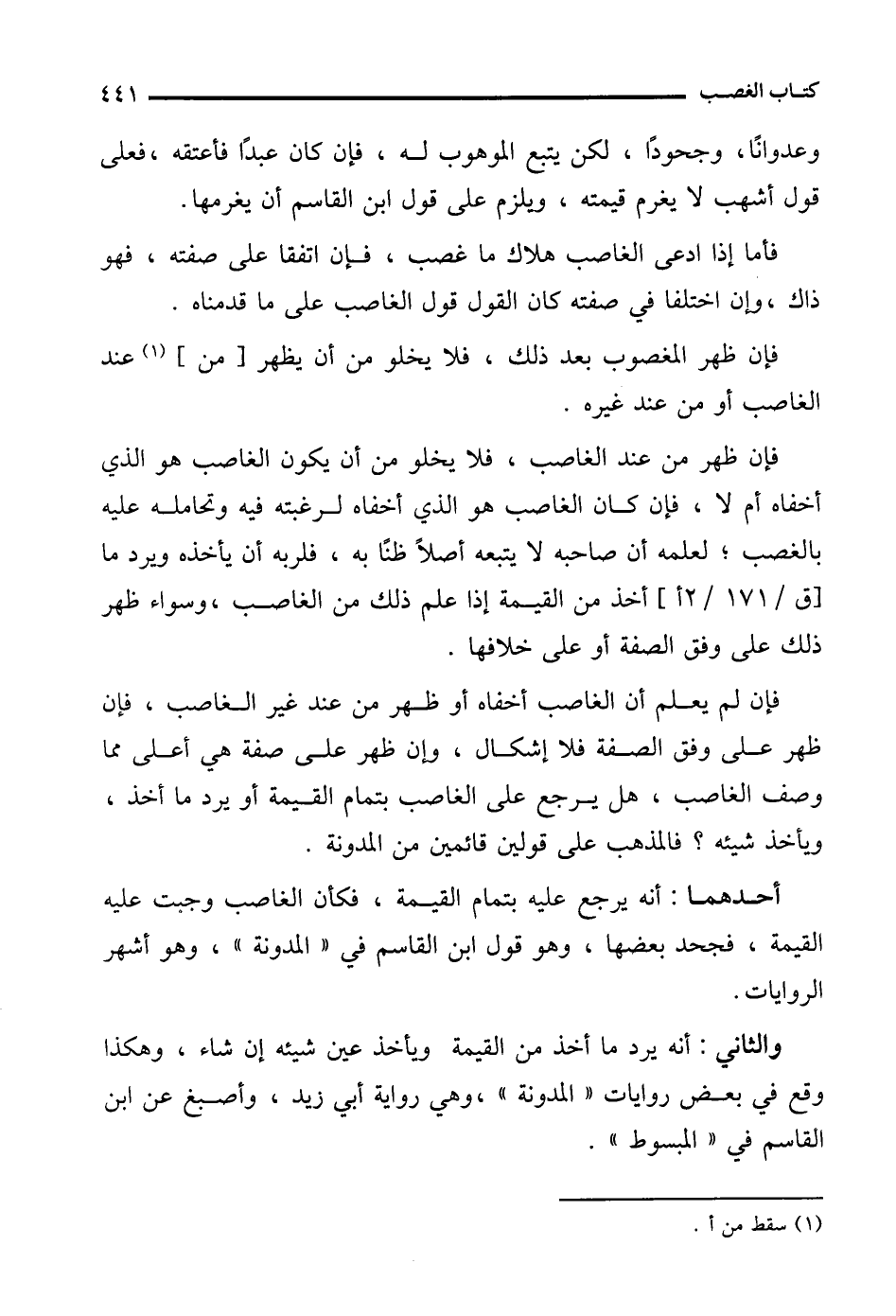 فإن لم يعلم أن الغاصب أخفاه أو ظهر من عند غير الغاصب، فإن ظهر على وفق الصفة فلا إشكال، وإن ظهر على صفة هي أعلى مما وصف الغاصب، هل يرجع على الغاصب بتمام القيمة أو يرد ما أخذ، ويأخذ شيئه؟ فالمذهب على قولين قائمين من المدونة.