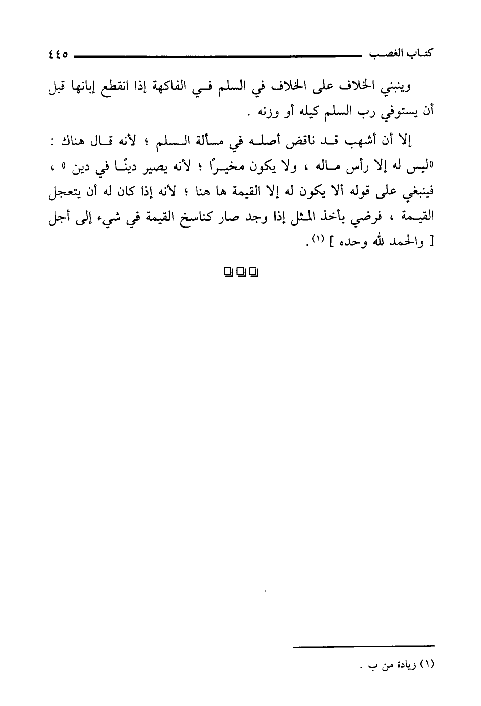 إلا أن أشهب قد ناقض أصله في مسألة السلم؛ لأنه قال هناك: "ليس له إلا رأس ماله، ولا يكون مخيرًا؛ لأنه يصير دينًا في دين"، فينبغي على قوله ألا يكون له إلا القيمة هاهنا؛ لأنه إذا كان له أن يتعجل القيمة، فرضي بأخذ المثل إذا وجد صار كناسخ القيمة في شيء إلى أجل [والحمد لله وحده] (¬1).