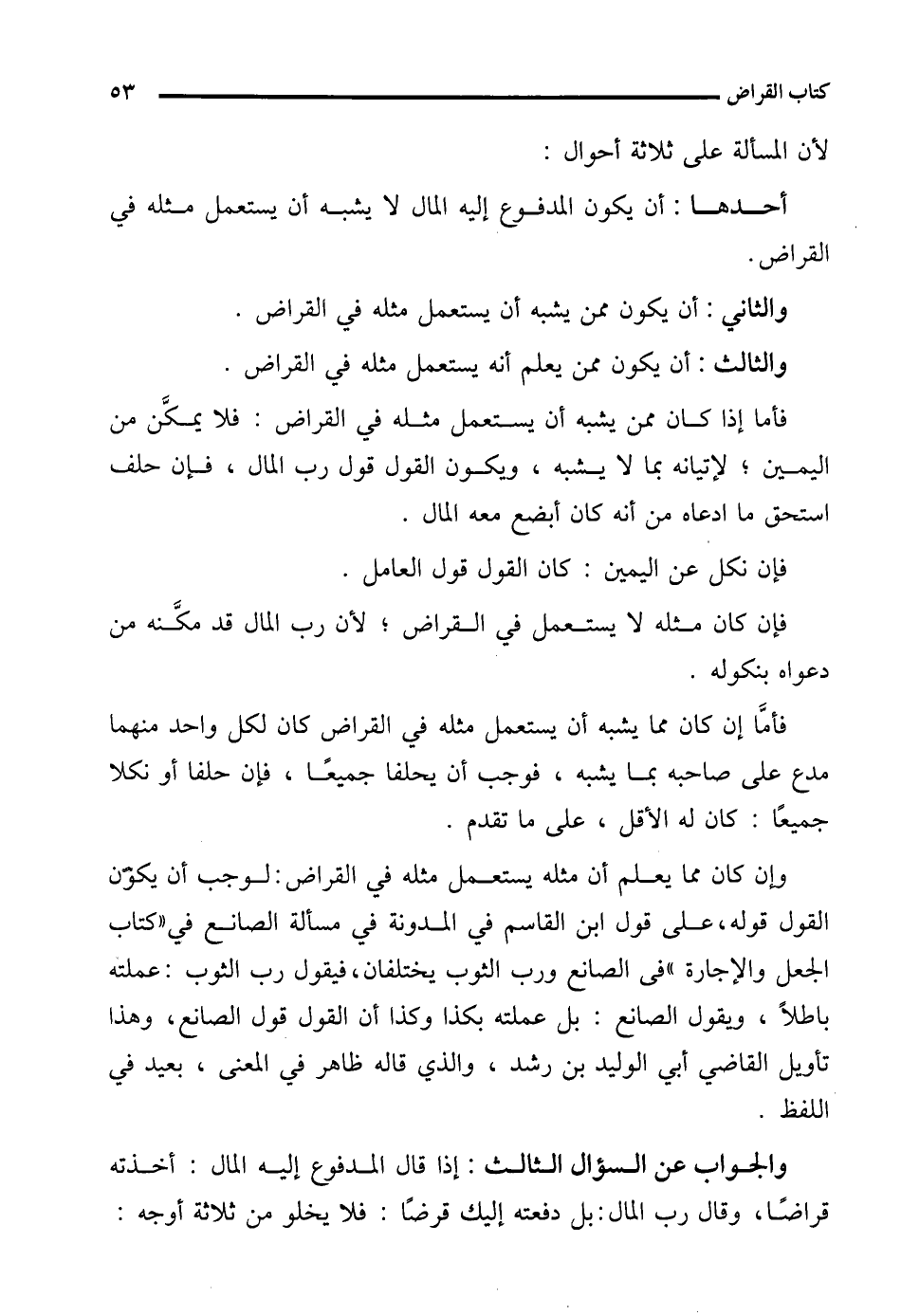 والجواب عن السؤال الثالث: إذا قال المدفوع إليه المال: أخذته قراضًا، وقال رب المال: بل دفعته إليك قرضًا: فلا يخلو من ثلاثة أوجه: