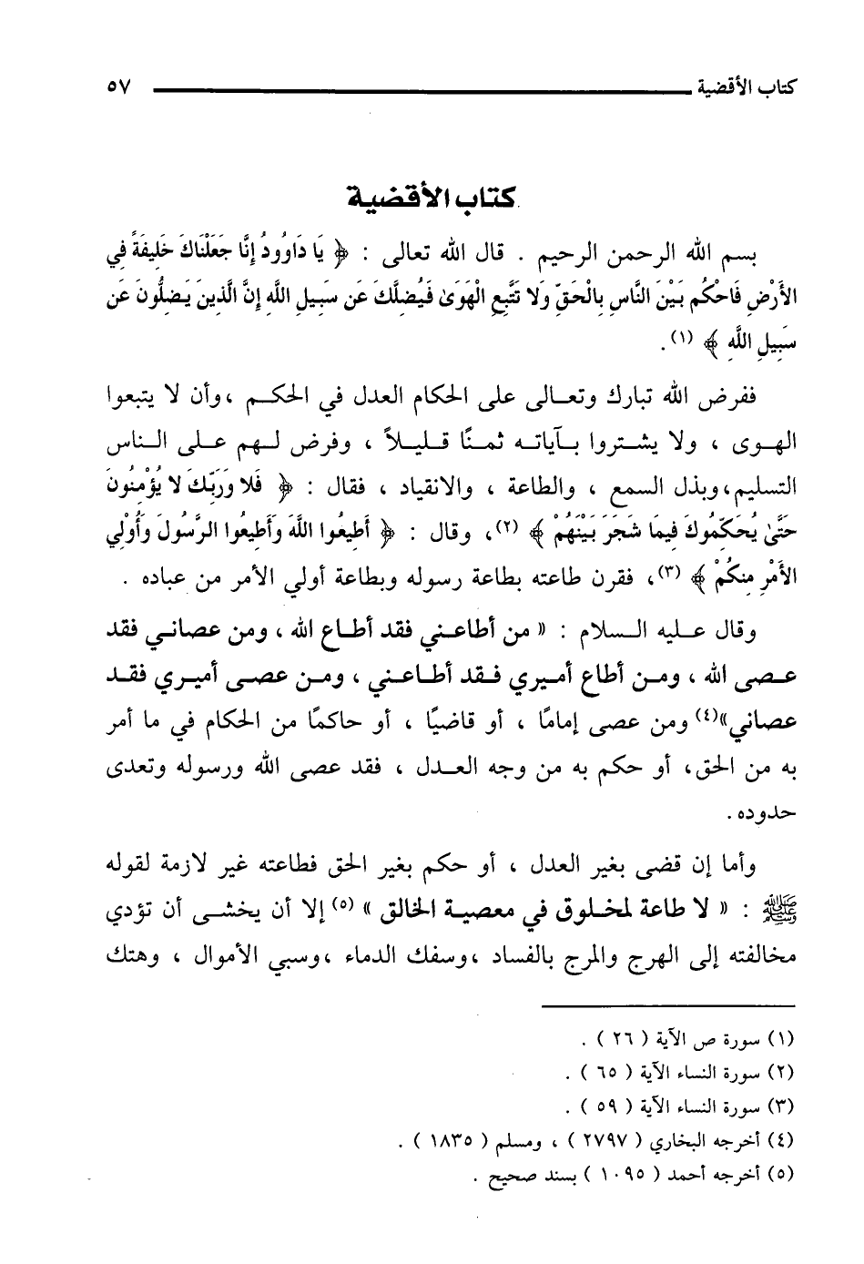 بسم الله الرحمن الرحيم. قال الله تعالى: {يَا دَاوُودُ إِنَّا جَعَلْنَاكَ خَلِيفَةً فِي الْأَرْضِ فَاحْكُمْ بَيْنَ النَّاسِ بِالْحَقِّ وَلَا تَتَّبِعِ الْهَوَى فَيُضِلَّكَ عَنْ سَبِيلِ اللَّهِ إِنَّ الَّذِينَ يَضِلُّونَ عَنْ سَبِيلِ اللَّهِ} (¬1).
