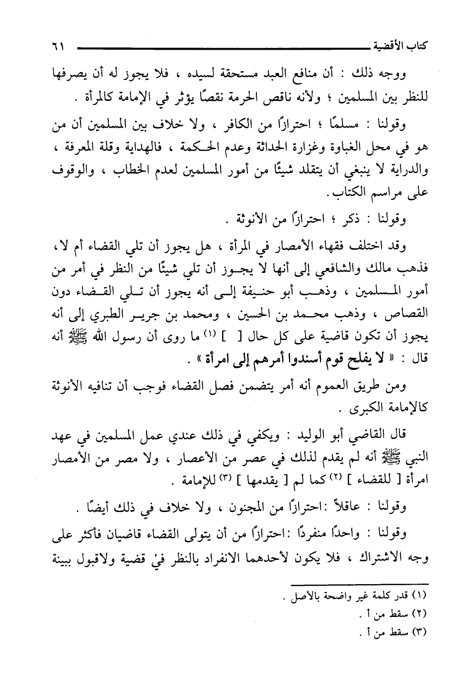 وقد اختلف فقهاء الأمصار في المرأة، هل يجوز أن تلي القضاء أم لا، فذهب مالك والشافعي إلى أنها لا يجوز أن تلي شيئًا من النظر في أمر من أمور المسلمين، وذهب أبو حنيفة إلى أنه يجوز أن تلي القضاء دون القصاص، وذهب محمد بن الحسين، ومحمد بن جرير الطبري إلى أنه يجوز أن تكون قاضية على كل حال [. .] (¬1) ما روى أن رسول الله - صلى الله عليه وسلم - أنه قال: "لا يفلح قوم أسندوا أمرهم إلى امرأة".